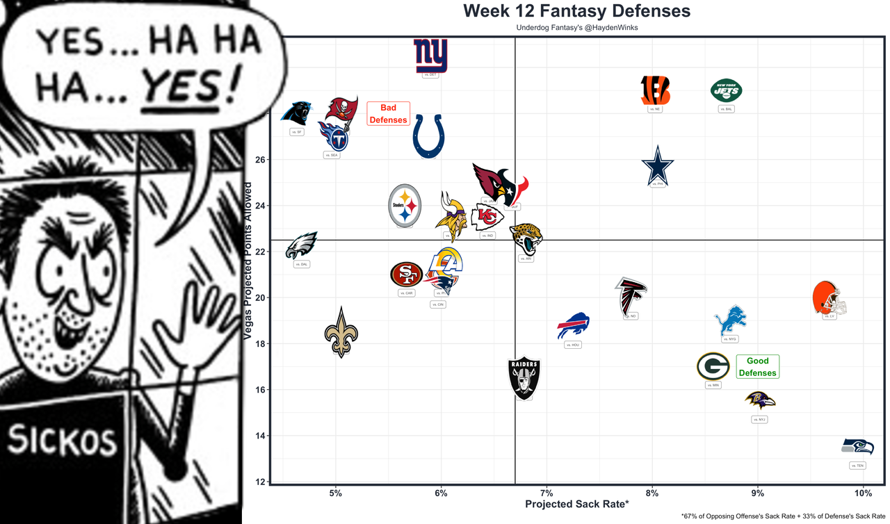 The best defenses of the week are the Seahawks, Ravens, Packers, Raiders, Lions, and Browns. Those are great spots across the board. The next tier includes the Falcons, Bills, and Saints.