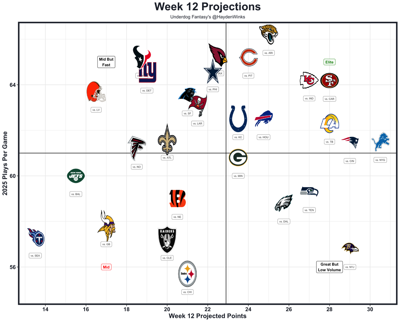 The Titans are lowest in projected points (13.5).