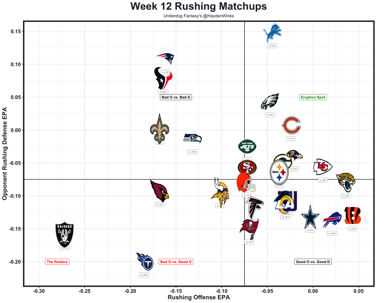 He's unlikely to get this clear of usage, but Stevenson's last 4 healthy games were averaging 11.4 expected half PPR points and the Patriots have a 29.0-point team total against a tanking rival. There's room for both to get home, even behind this OL. Stevenson is live for a goal-line vulture as the thiccest dude in the backfield, but I'd be stunned if he's the clear snap leader coming off a toe injury. He's probably a change of pace hammer instead.