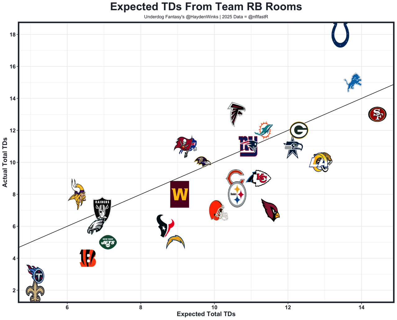 This assumes Rhamondre Stevenson (toe) and/or Terrell Jennings are active here, versus only having D'Ernest Johnson behind Henderson last week. This is what the rotation was before their injuries, obviously noting that the 2nd-round pick had monster games since then. With Stevenson as the lead back in Weeks 7-8, Hendo had 0.9 and 7.4 expected half PPR points based on his usage. In Weeks 9-10 with only Jennings partly playing, Hendo had 14.7 and 12.5 expected half PPR points. Last week without either, Hendo was at 21.9 expected half PPR points. The cat is out of the bag now that they've figured out how to properly use Hendo's skillset, but Stevenson is paid well for this and next year. I think it'll be closer to the split with Jennings in Week 9 or so when both rotated. I'd still make Stevenson the slight favorite for goal-line touches, but the Patriots could also go full-blown Rookie Bump here. Nobody fully knows, so live your best life.