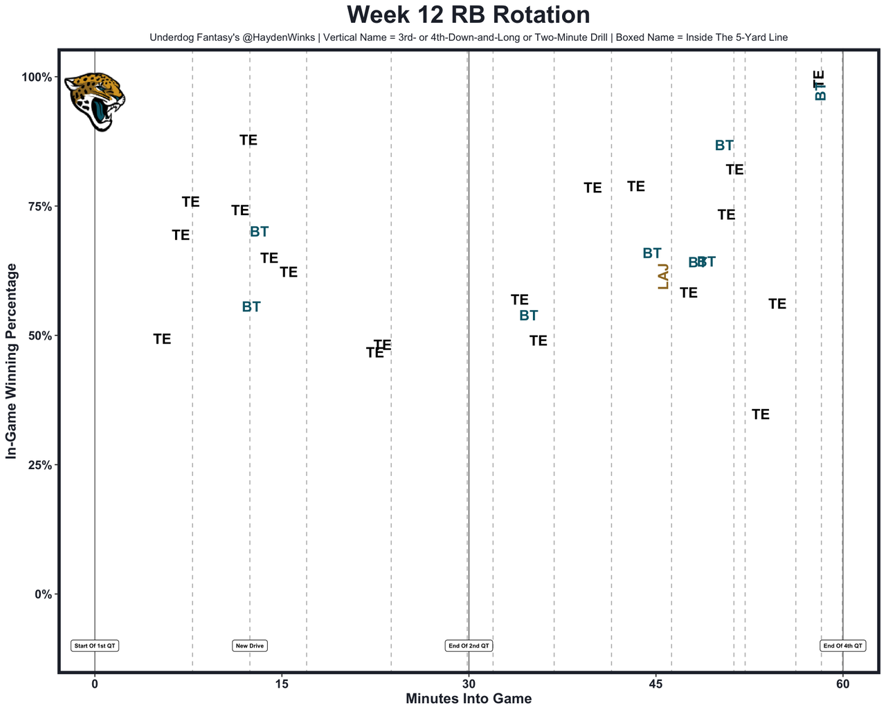 He's the RB43 on RB38 usage this month, only playing 21% snaps last week and under 33% snaps in every game this season. Tuten can steal a goal-line score or rip an explosive, but it's a tough needle to thread while Travis Etienne plays well.