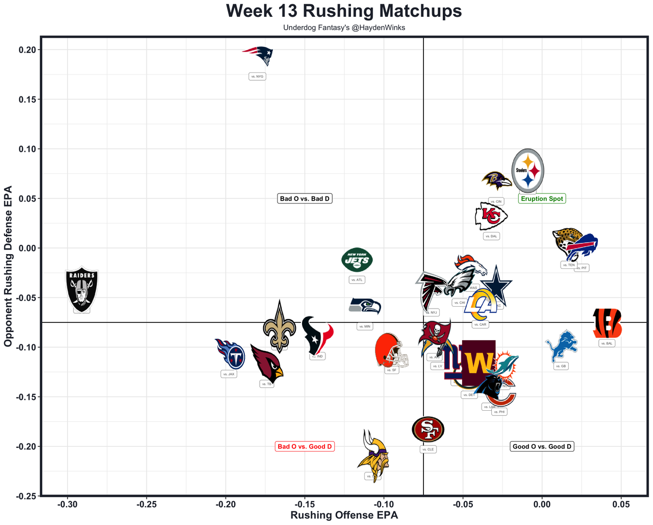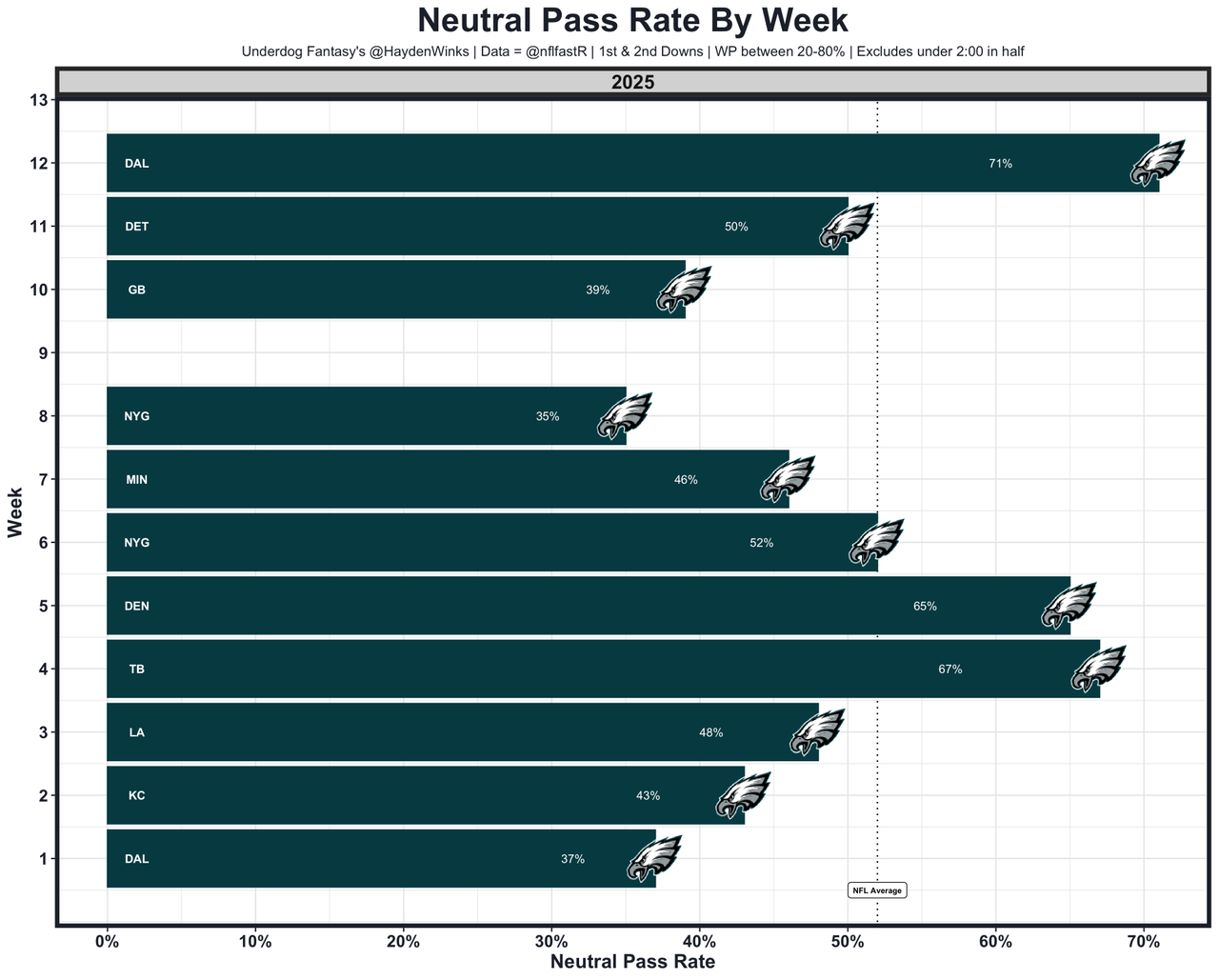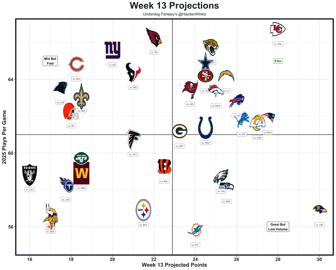 The Eagles haven't been able to run it well all year long, and last week, they passed the ball at the highest rate in neutral situations. Coincidence? I'm not sure. The pass game is largely working right now, and then Hurts finishes off drives with Tush Pushes. That's great for Hurts in fantasy if it continues. The Eagles are 6th in projected points (25.75) against a Bears defense who is limping into the holidays.