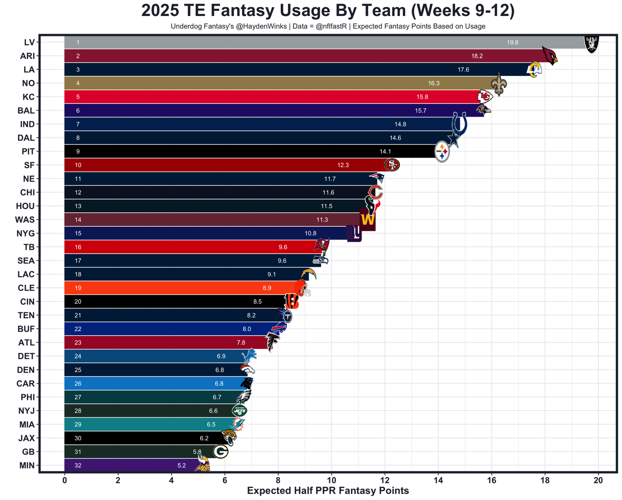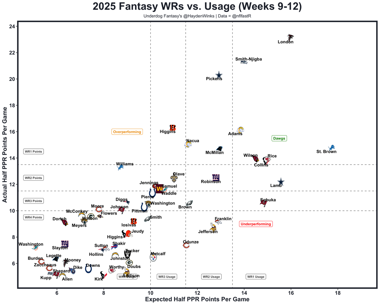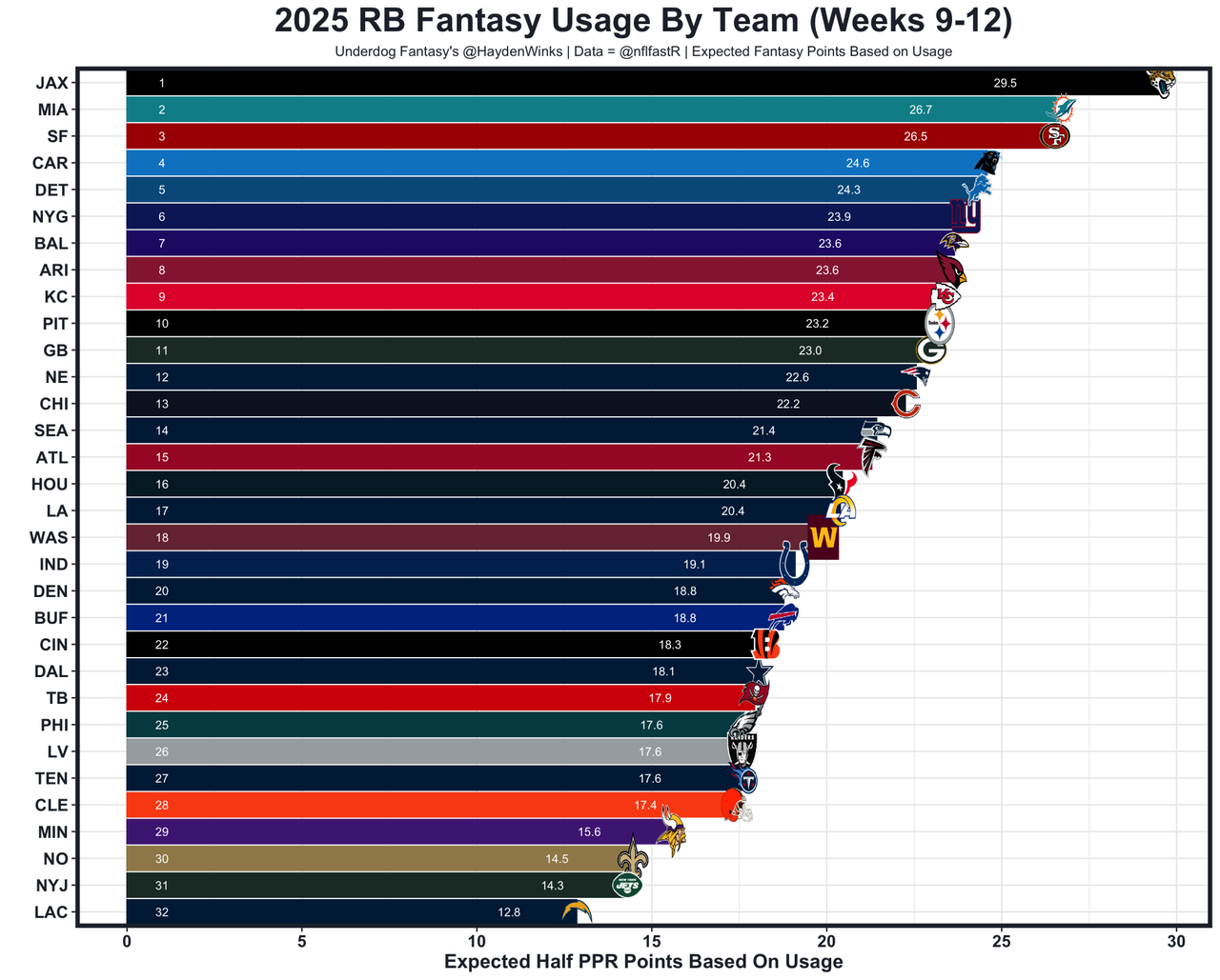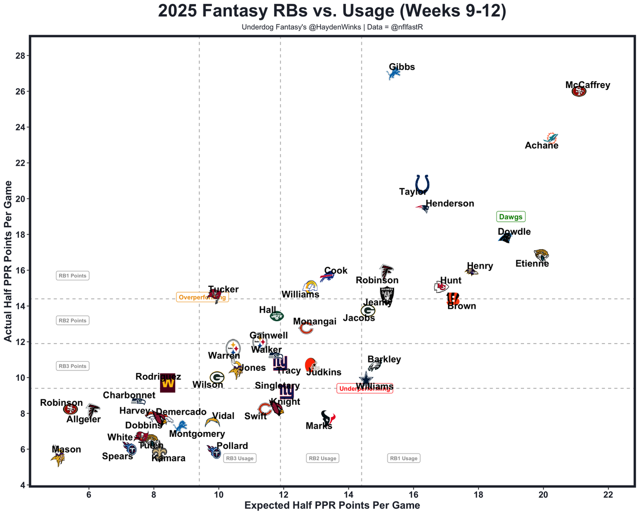 We'll see if Omarion Hampton (ankle) is ready off the bye, but if he's not, then Vidal has been the RB26 on RB21 usage this month. That's the lowest it's been since he's been starting, which isn't a coincidence with LT Joe Alt out for the year. In 5 starts, he's averaging 13.3 half PPR points on 15.5 expected points. RB2 numbers no doubt. Vidal does get a comfy matchup at home off a bye against a Raiders team mentally in Cabo, so the Chargers are projected for 25.5 points. It's a good spot.