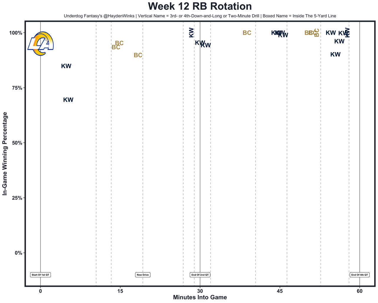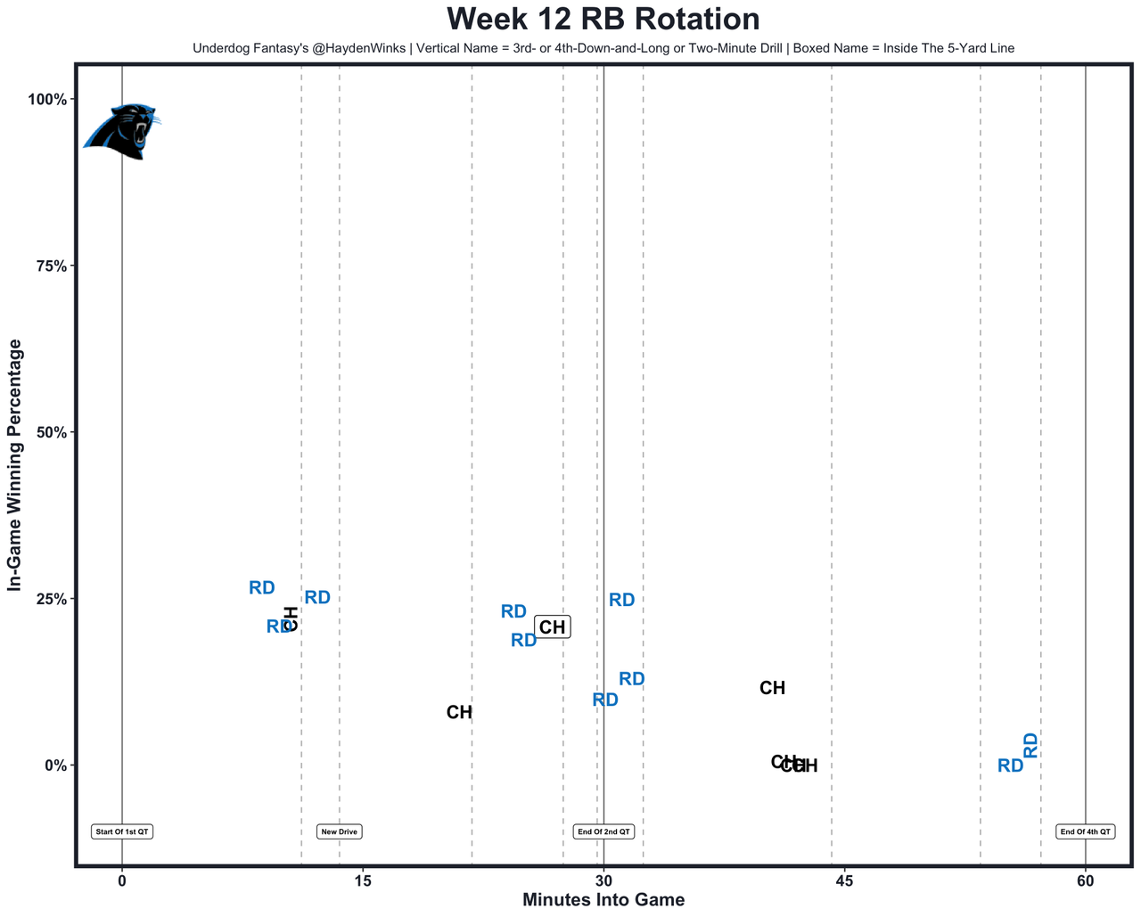 The Rams stop just about everyone, and I can't explain why Dowdle wasn't more involved on Monday Night Football. The Panthers used Chuba Hubbard a little more than normal and dropped back to pass far more than usual. Dowdle only had 8.5 expected half PPR points, while Hubbard had 7.3. That gap had been wider than 11 expected half PPR points in the 3 previous games. It also hurts the Panthers only project for 18.0 points this week.