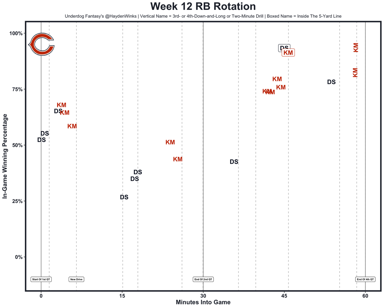 The Bears used a drive-by-drive split with Swift starting. Kyle Monangai is a threat, and it's okay to acknowledge Swift was a top-18 RB in 5 straight weeks before finishing outside the top-28 in back-to-back weeks. Adding to the worries is a matchup with the Eagles' newly-built front seven. The Bears are only projected for 18.5 points this time around. Adjust, unless you're a Revenge Game Bro.
