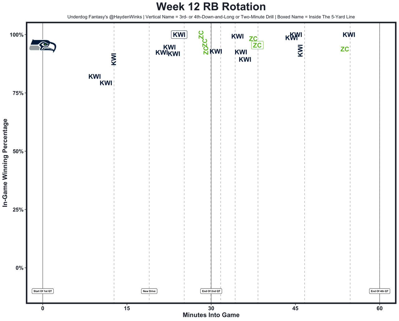 He played 17-of-18 snaps on the first 3 drives, then Zach Charbonnet handled the 2-minute drill and a goal-line carry later on. Not ideal but progress. Walker's 13.2 expected half PPR points last week was a season-high. This week's matchup with the Vikings is tough on paper, but Seattle is 10.5-point home favorites with a 26.0 point team total. Field position and script should be on his side.