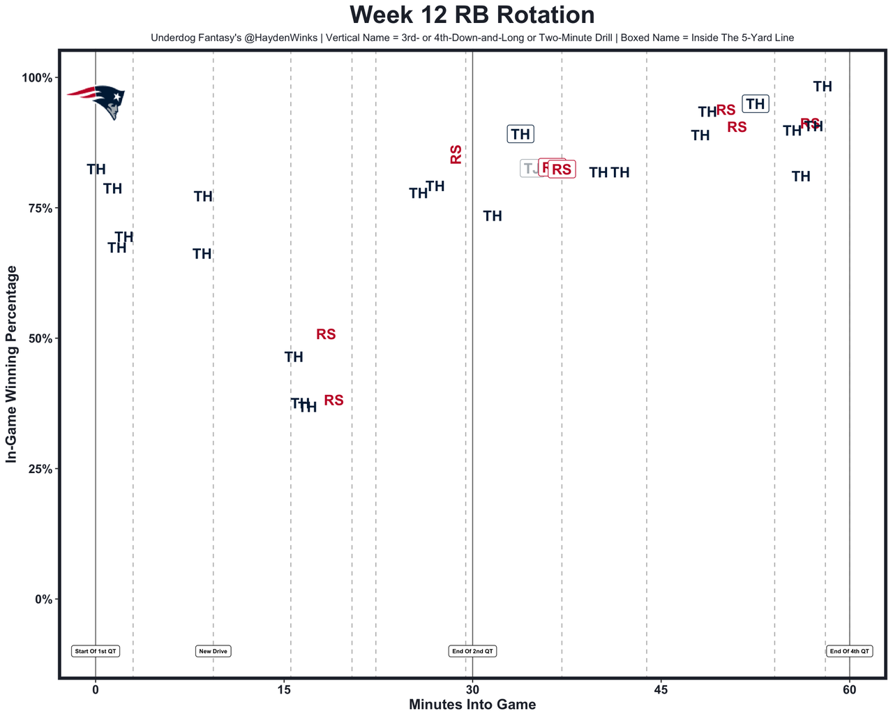 The Patriots are 3rd in projected points (27.5) against the worst rushing defense. The Giants were destroyed by Jahmyr Gibbs, enough to have DC Shane Bowen fired. Henderson's explosiveness will be intriguing, but his own OL lost both rookie starters, including 1st-round LT Will Campbell last game. It's a terrible OL, and Henderson's role at the goal line is iffy at best. Henderson had 15.3 expected half PPR points in a similarly great matchup last week, and Rhamondre Stevenson (toe) is likely to play more, not less, as he gets away from his injury.