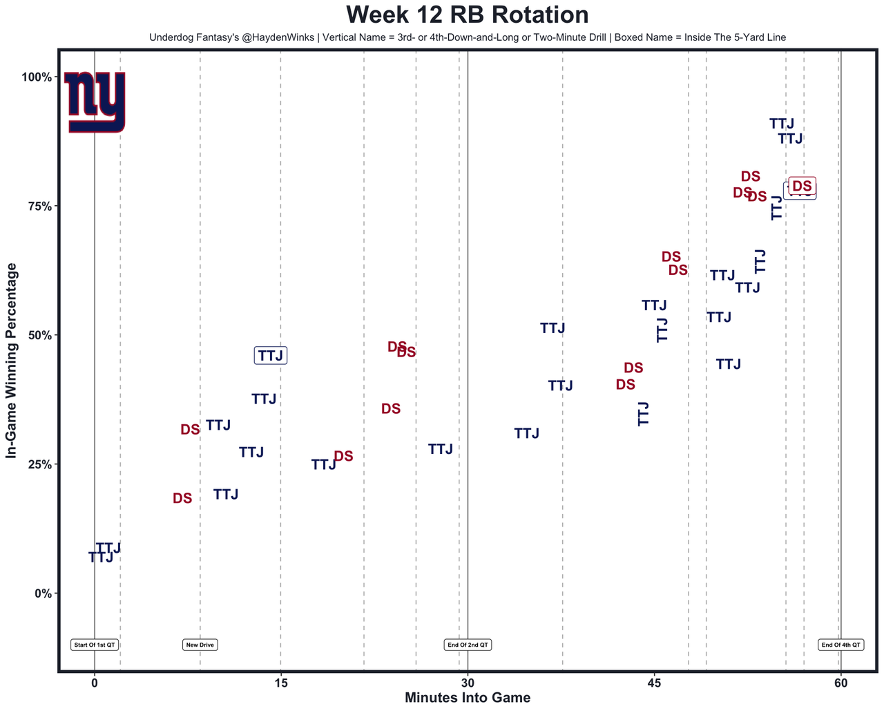 He finally had an inside the 10-yard line attempt last week, but equally importantly, continues to make plays between the 20s in a suddenly functional offense. The Giants are in safe hands with either Jameis Winston or Jaxson Dart (concussion), and Tracy should be leaned on more than expiring-contract veteran Devin Singletary as the season progresses. Last week was a season-high 18.4 expected half PPR points, bringing him up to RB22 on RB23 usage this month without Cam Skattebo (ankle). The Patriots are showing some signs of weakness on defense without DT Milton Williams, so it's not surprising to see the Giants projected for 20.0 points here.