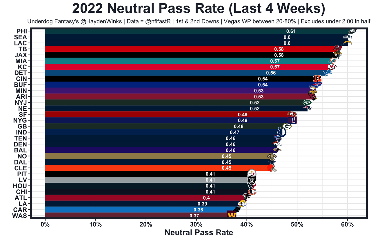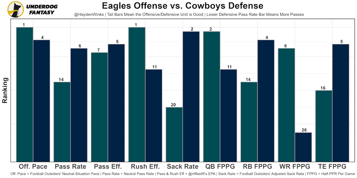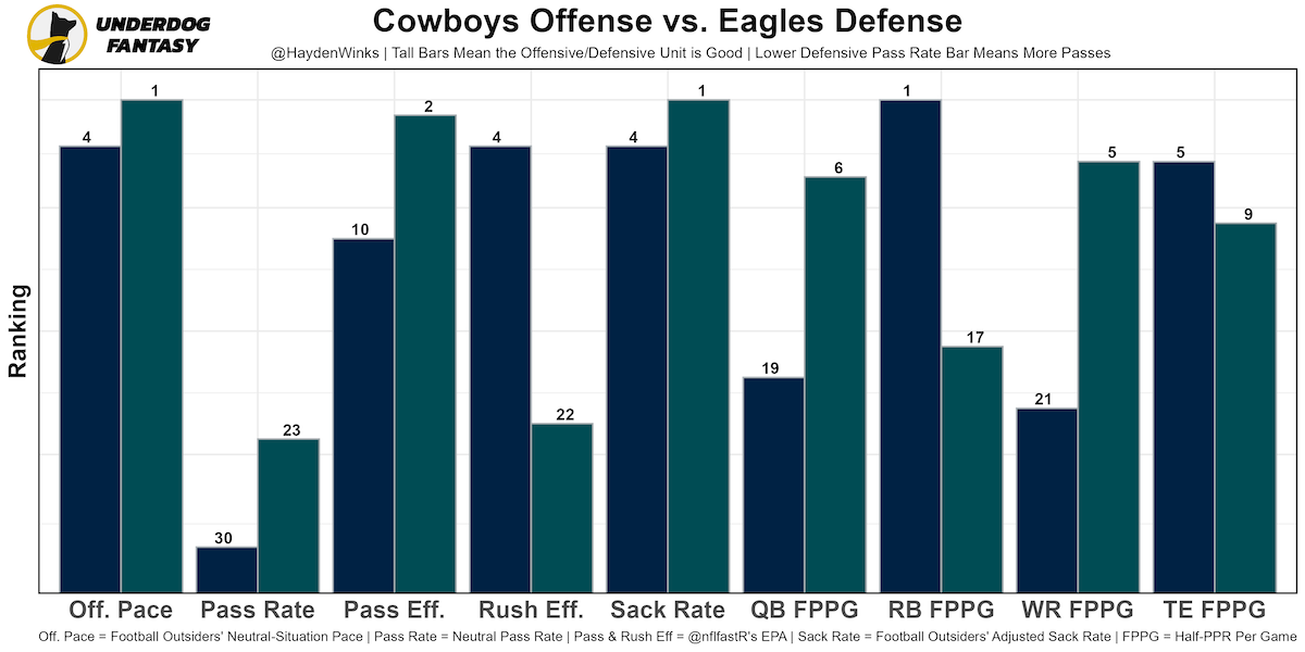 Offenses facing the Eagles defense have the lowest neutral pass rate in the NFL (44%), and we've seen the Cowboys lean heavily on the ground. That paired with a less-potent Eagles offense without Jalen Hurts leave Prescott in the mid-QB1 bucket despite a healthy 25.75 team total.