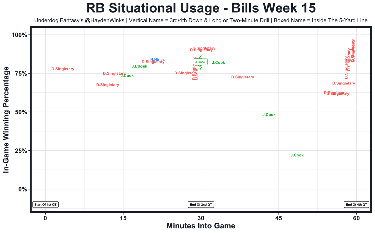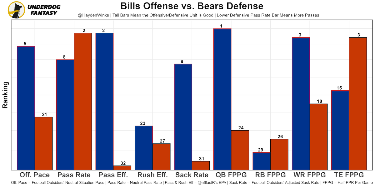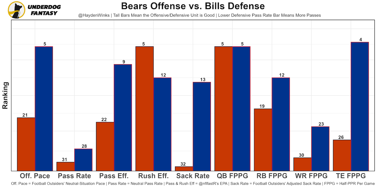 Weather is very concerning (9° F with a 25% chance of snow and 25 MPH winds), but Josh Allen can run like a mad man and probably can throw in these conditions better than any QB in the NFL. We'll see if Buffalo changes their pass-heavy ways in these conditions because offenses can win on the ground OR through the air against this tanking Bears defense. Allen will be doing this without veteran C Mitch Morse (concussion), however. Let's see if backup C and starting RG Ryan Bates (ankle) can play through injury.