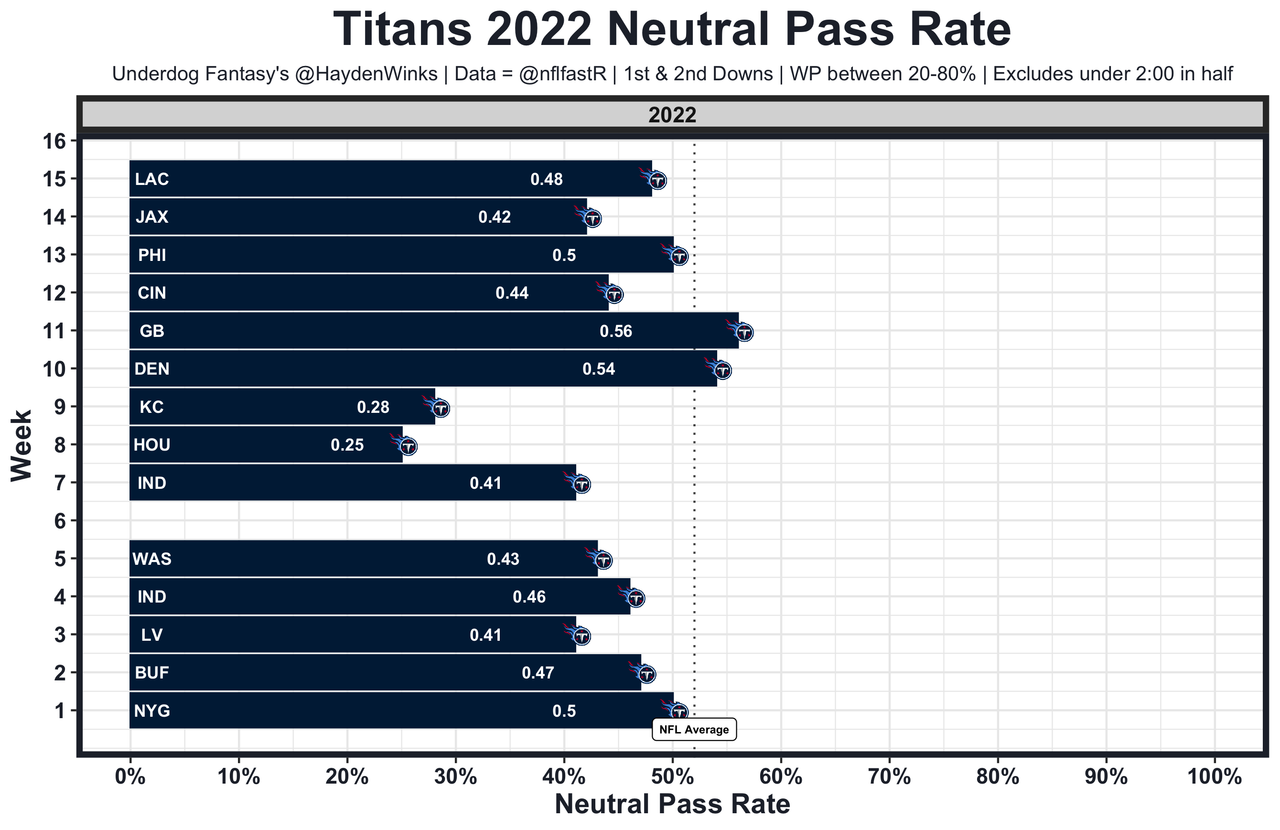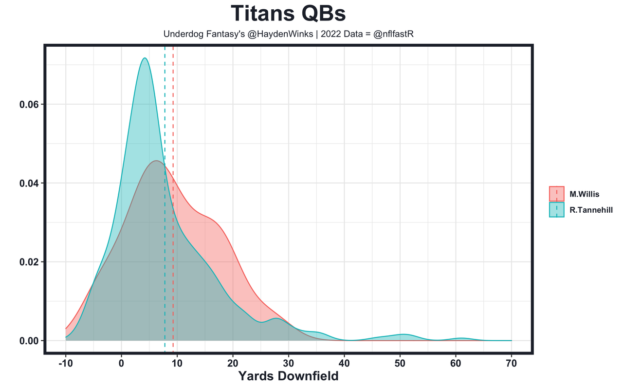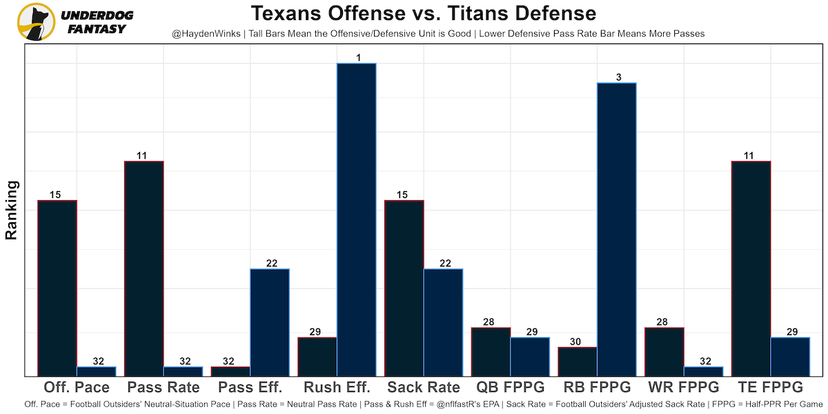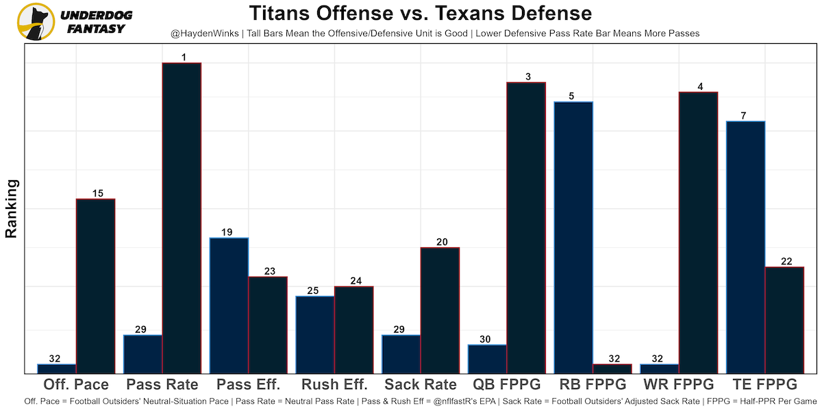 I'm expecting Ryan Tannehill (ankle) to miss after a DNP on Tuesday and third-string QB Josh Dobbs being signed off the practice squad ... Weather is slightly concerning (20° F with a 0% chance of snow and 11 MPH winds), but that will effect Willis less, as a bazooka-armed dual threat QB. The question is: Is Malik Willis good enough to take advantage of the cupcake macthup? In Week 7, Willis had a brutal stat line against these Texans (55 passing yards on 10 passes with an INT, plus 12 rushing yards on 5 carries). Of course, Derrick Henry balled out (32 carries for 219 yards and 2 TDs) that game, so it's possible that swings towards Willis a bit more this time. He had 3 and 5 designed QB runs in his two starts, the two games with the lowest neutral pass rates of the Titans' season. To make matters worse, the Titans top-3 offensive linemen are out: LT Taylor Lewan (IR), C Ben Jones, and RG Nate Davis.