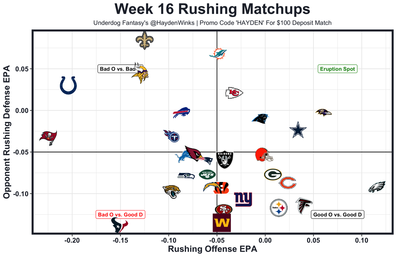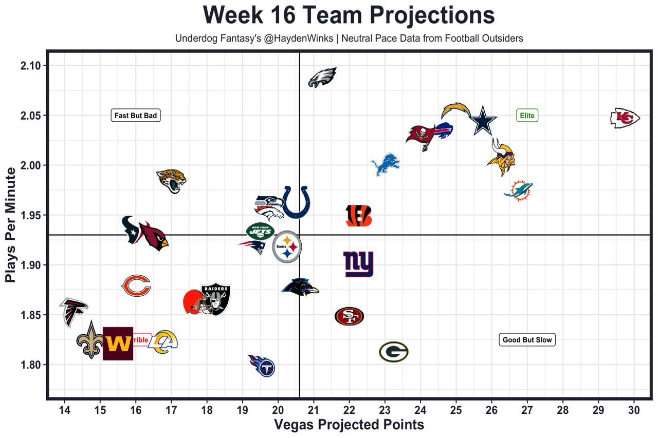 Weather is very concerning (9° F with a 12% chance of snow and 25 MPH winds), as is the Bears lowly 15.75-point team total. Fields, as usual, needs to ball the hell out on the ground. He rebounded with 8 designed runs in Week 15 out of the bye. Don't expect Chase Claypool (limited-DNP) or Equanimeous St. Brown (concussion) to play. 4for4's Connor Allen tweeted that Fields' passing yards line (137.5) is the lowest of any legit starting QB since he's been doing this.