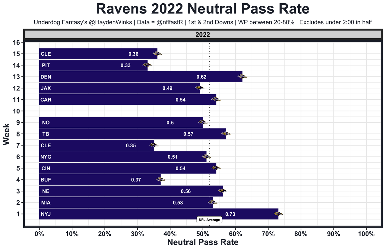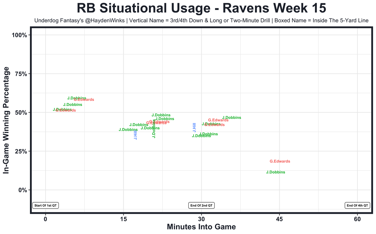 J.K. Dobbins - The Ravens' neutral pass rate has dipped with Tyler Huntley under center, and this week's weather will give them even more incentive to run the ball. Dobbins has ripped off big runs despite questionable long speed due to an impressive run scheme, but he's also one of the biggest negative regression candidates. He's only posted 9.4 and 8.3 expected half PPR points since returning. Gus Edwards has been at 6.8 and 4.3 over that span as the clear No. 2 back.