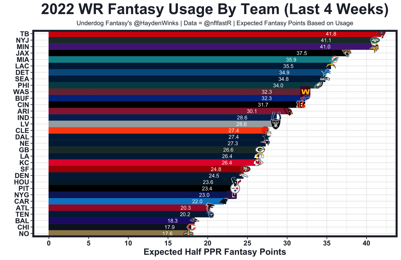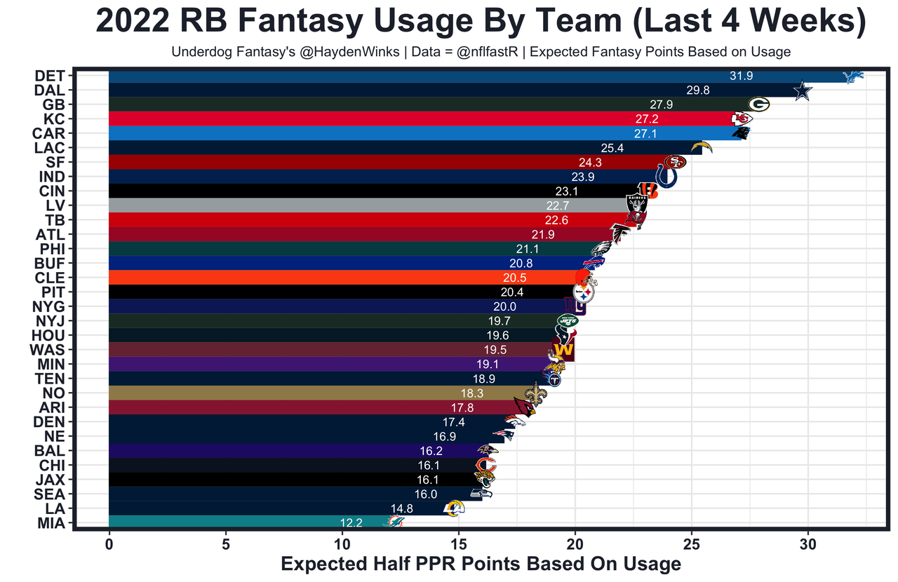 David Montgomery - Khalil Herbert returning is bad news. His expected half PPR points drop from 14.0 to 10.9 with him, and it could get worse down the stretch with the front office needing to make decisions on each back this offseason. Herbert is unproven. Montgomery is a free agent. This week, however, there's paths to each hitting home with weather really acting up. Unfortunately, the Bears team total is 3rd-lowest on the week.