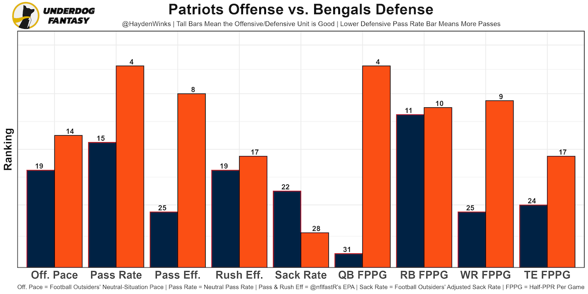 Weather is slightly concerning (21° F with a 2% chance of snow and 13 MPH winds), and so is the matchup. New England is 1st in passing EPA allowed, 3rd in adjusted sack rate, and 19th in offensive pace. The positive is Burrow's weapons are good enough to take advantage of the Patriots' MOFC (middle of field closed) defense with one-on-one matchups outside. Ultimately, this is meh environment with a 22.25-point team total.