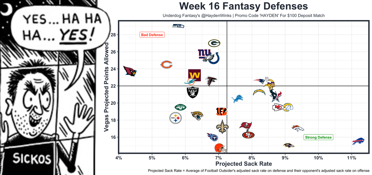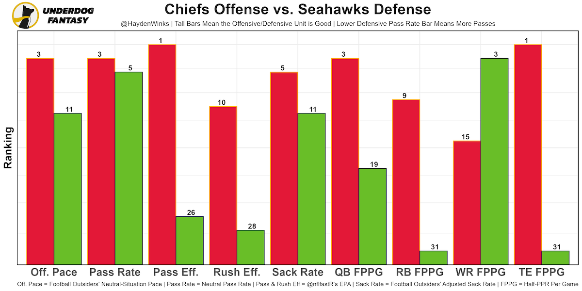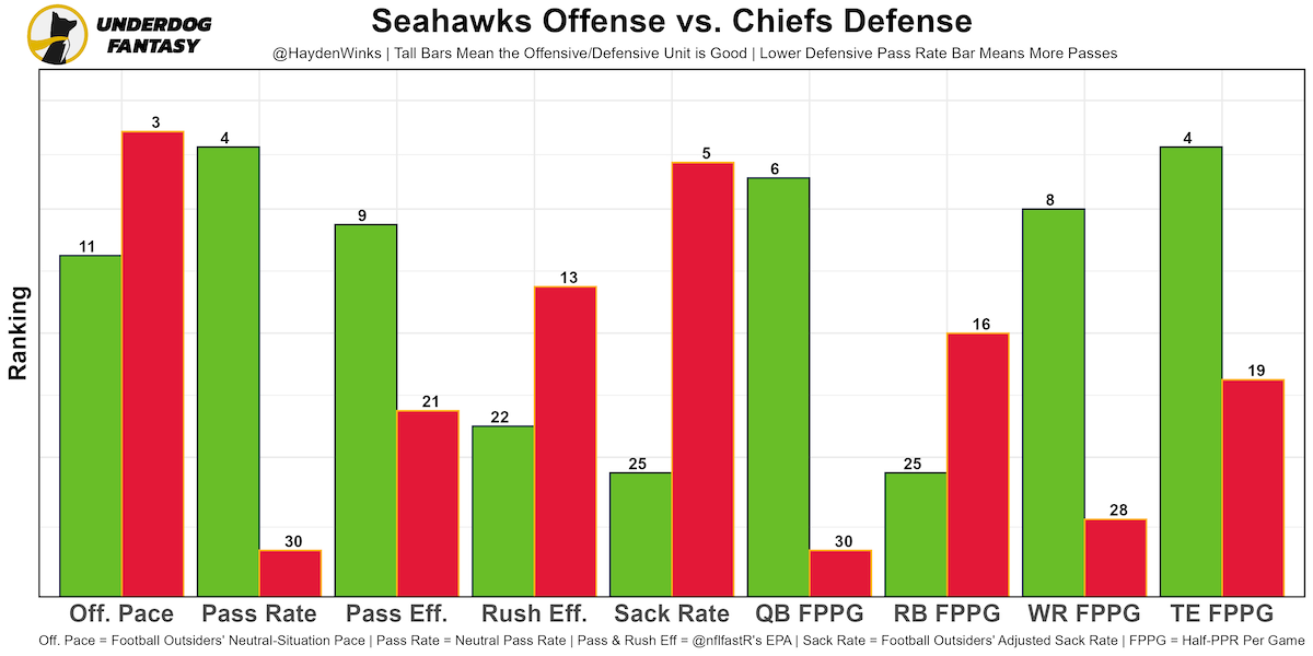 Weather is slightly concerning (11° F with a 0% chance of rain and 14 MPH winds), and no Tyler Lockett. But the game script (10-point dogs) and the Chiefs No. 30 fantasy QB defense work in his favor.