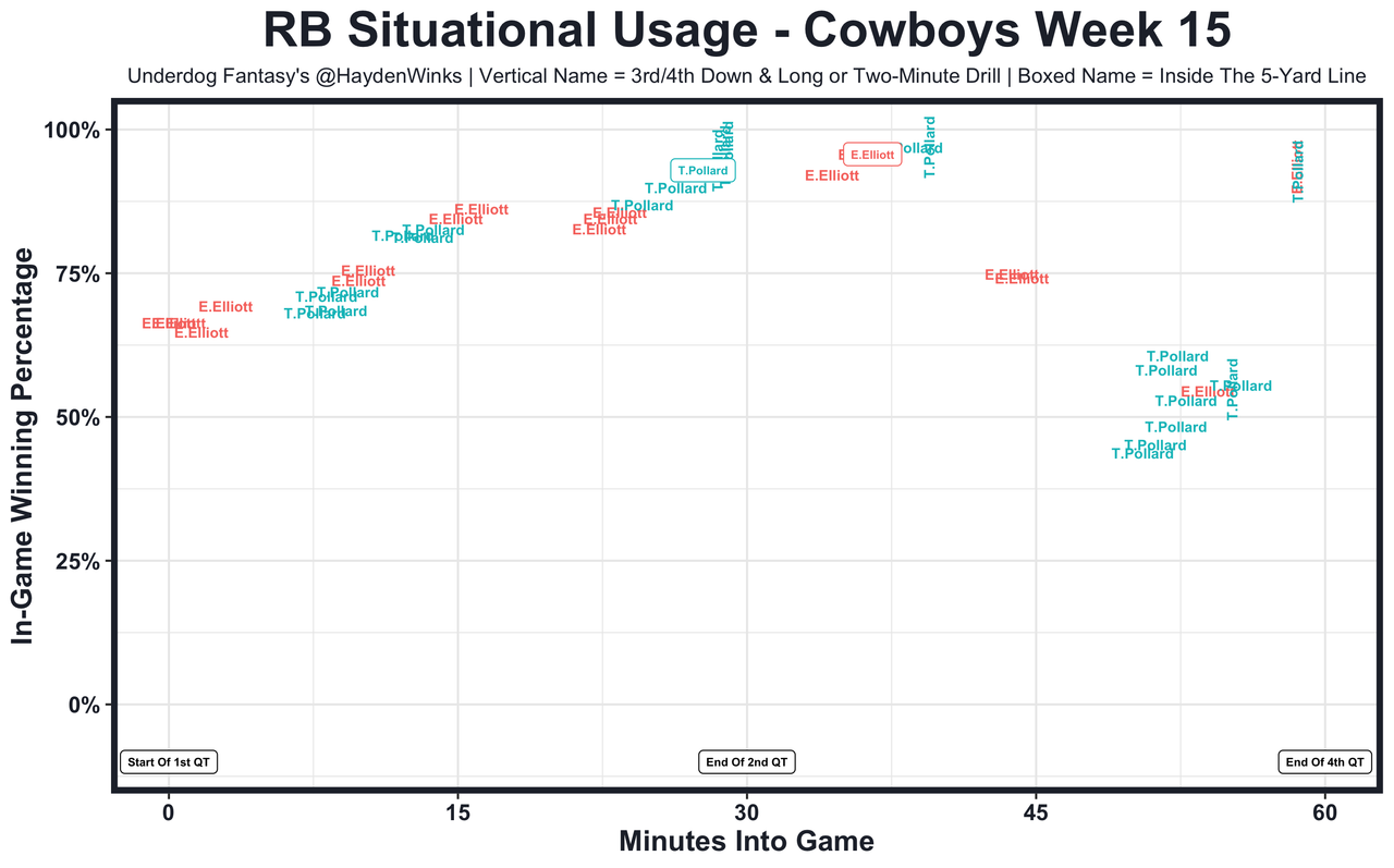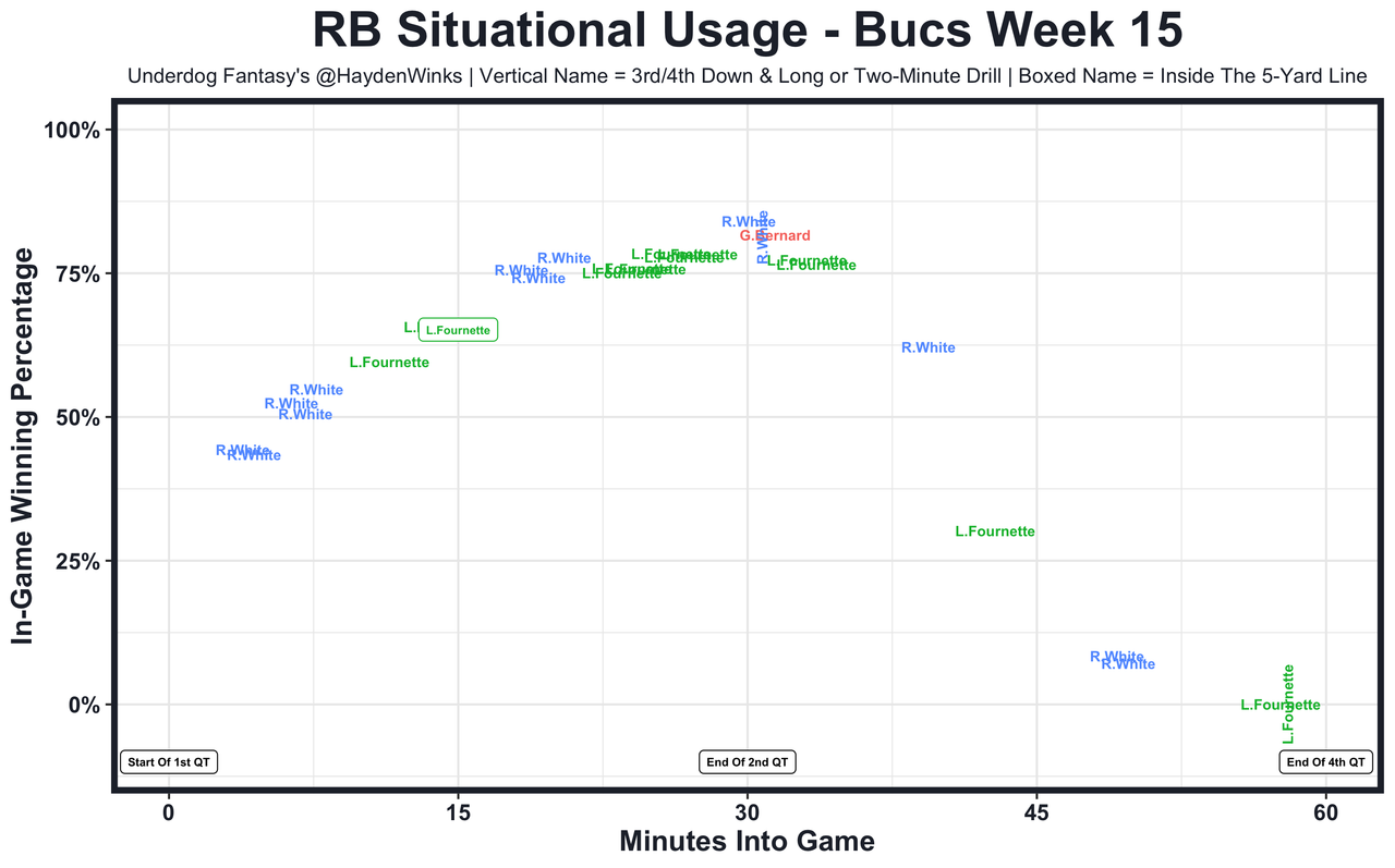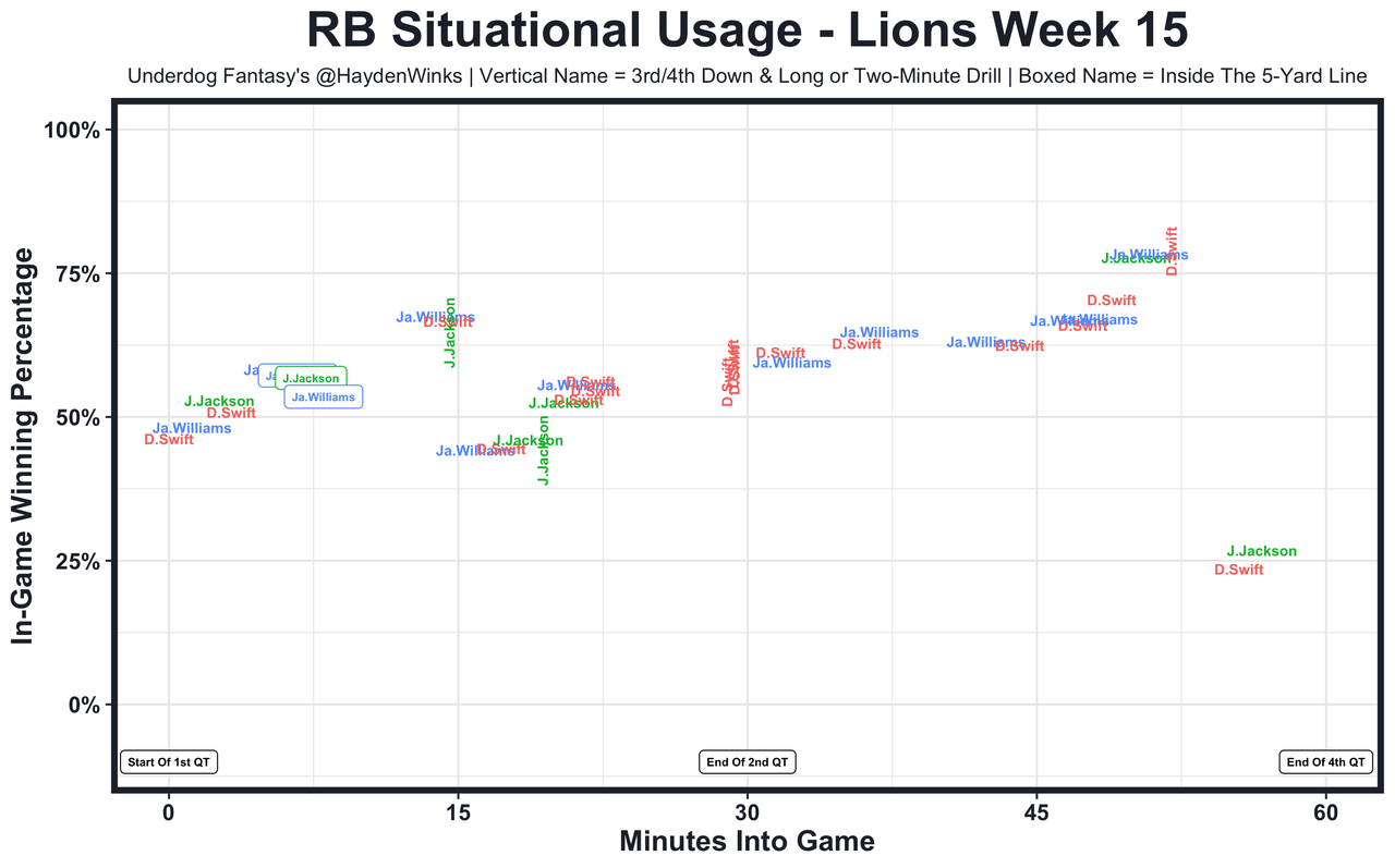 D'Andre Swift - Even with Justin Jackson battling through an illness, he played the same amount of snaps as Swift and Jamaal Williams. The latter saw the most inside the 5-yard line carries (as usual), while Swift mixed in between the 20s. He has 10.1 half PPR on 12.7 expected half PPR points since returning from his injury. The Gyration King: 12.4 half PPR on 12.1 expected half PPR. Perhaps both are used even more in 28-degree temperatures.