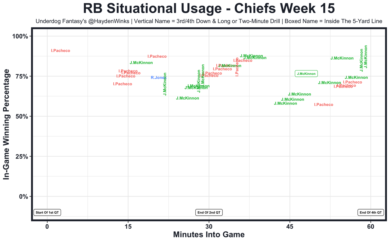 Jerick McKinnon - He's averaged 13.5 half PPR points on 11.5 expected half PPR points since the Chiefs' bye, and it's possible the Chiefs lean on him even more. Isiah Pacheco was momentarily benched last week, leaving McKinnon with a league-winning second half workload. If Pacheco fumbles (or gets Patrick Mahomes killed in pass pro) again, McKinnon could be a bellcow, as he was during the Chiefs 2021 NFL Playoffs run. When both are playing well, the Chiefs like Pacheco between the 20s on early downs and McKinnon in just about every other situation, including near the goal line. Andy Reid likes to galaxy brain in the red zone. McKinnon's skills fit that.