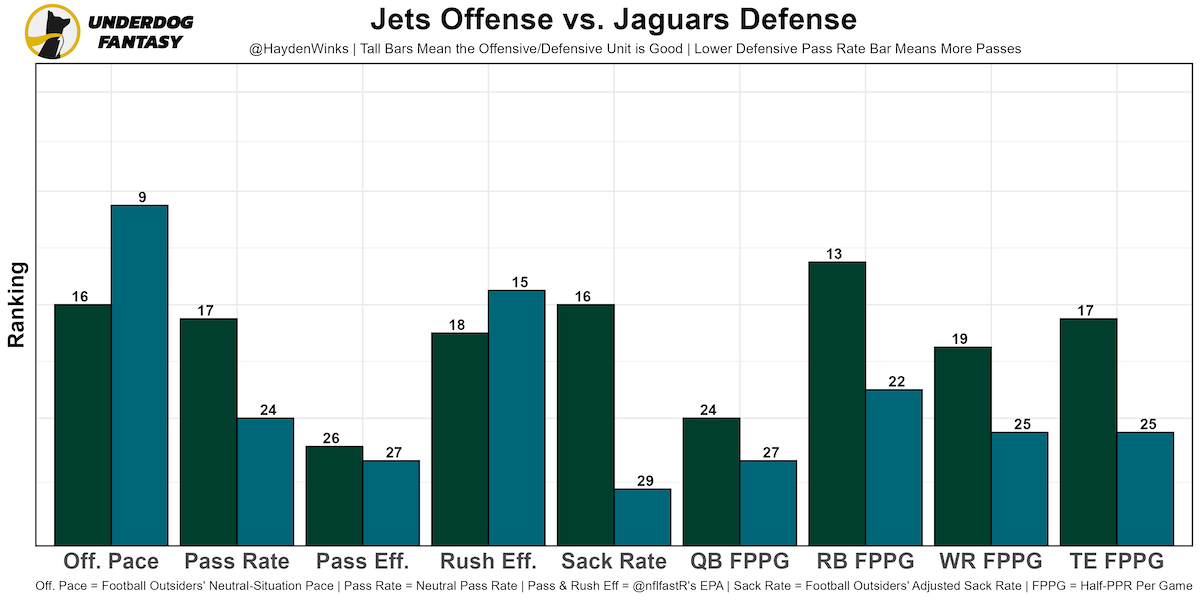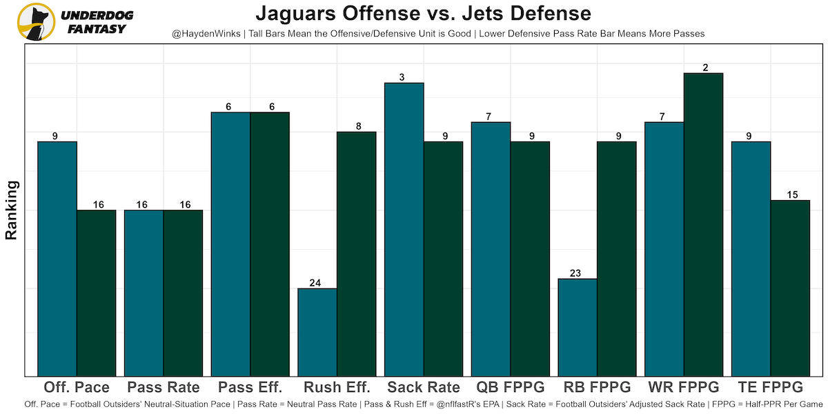 Weather is concerning (49° F with a 88% chance of rain and 16 MPH winds), and LT Cam Robinson has been ruled out. Tough run out for the on-fire Lawrence with the Jets No. 9 fantasy QB defense on deck.