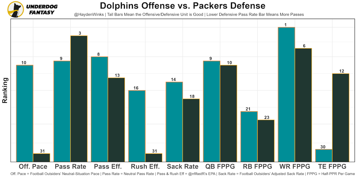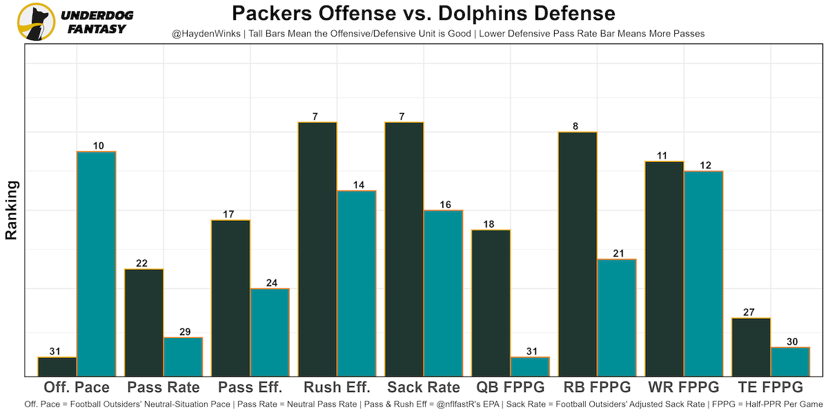 Weather is slightly concerning (49° F with a 36% chance of rain and 10 MPH winds).... The trend of playing Miami's receiver with tight coverage at the line of scrimmage continued in Buffalo (here's my thread of that game) , and it worked for the most part. I expect this to continue for the rest of the season, as it puts more pressure on Tua post snap and with arm strength. Still, it's not an adjustment that'll wipe out the offense. Miami will still get there's, especially with Miami top-8 in neutral pass rate. Green Bay is missing multiple solid starters on defense.