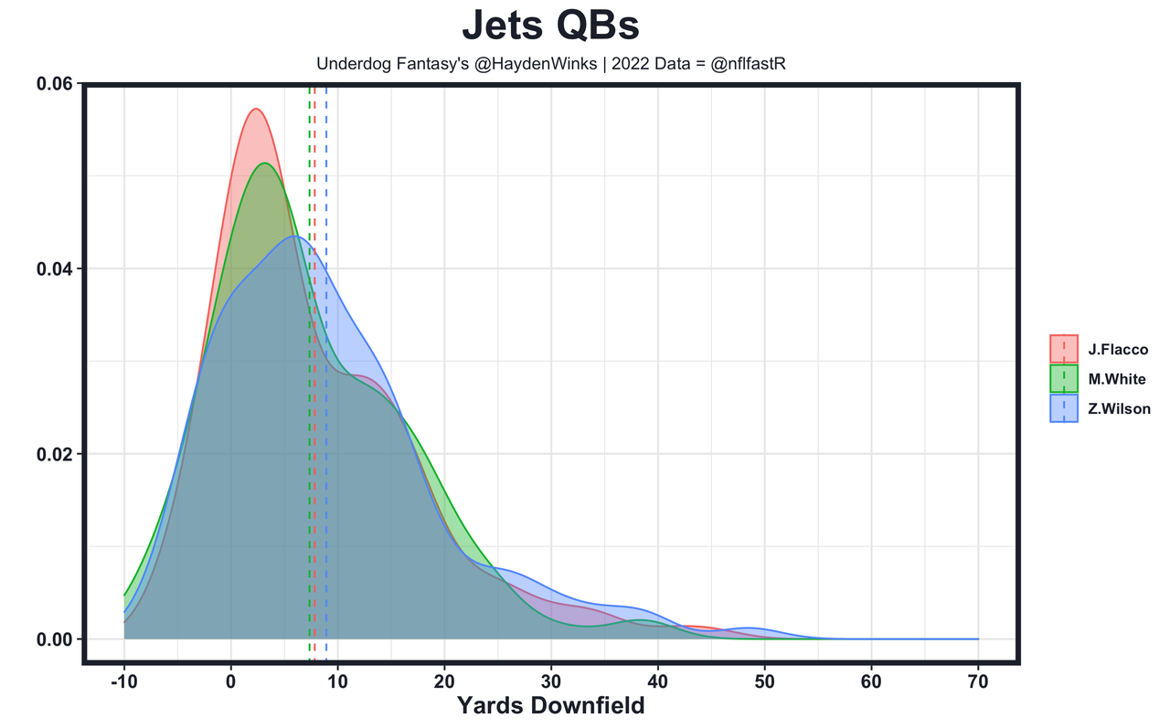 Garrett Wilson - The short throw has been largely erased with Zach Wilson under center, a part of the field Garrett Wilson can show off his YAC skills. The splits with/without Wilson are massive, though Wilson did manage a WR2-worthy 12.5 expected half PPR points last week. Jacksonville's defense is mid.