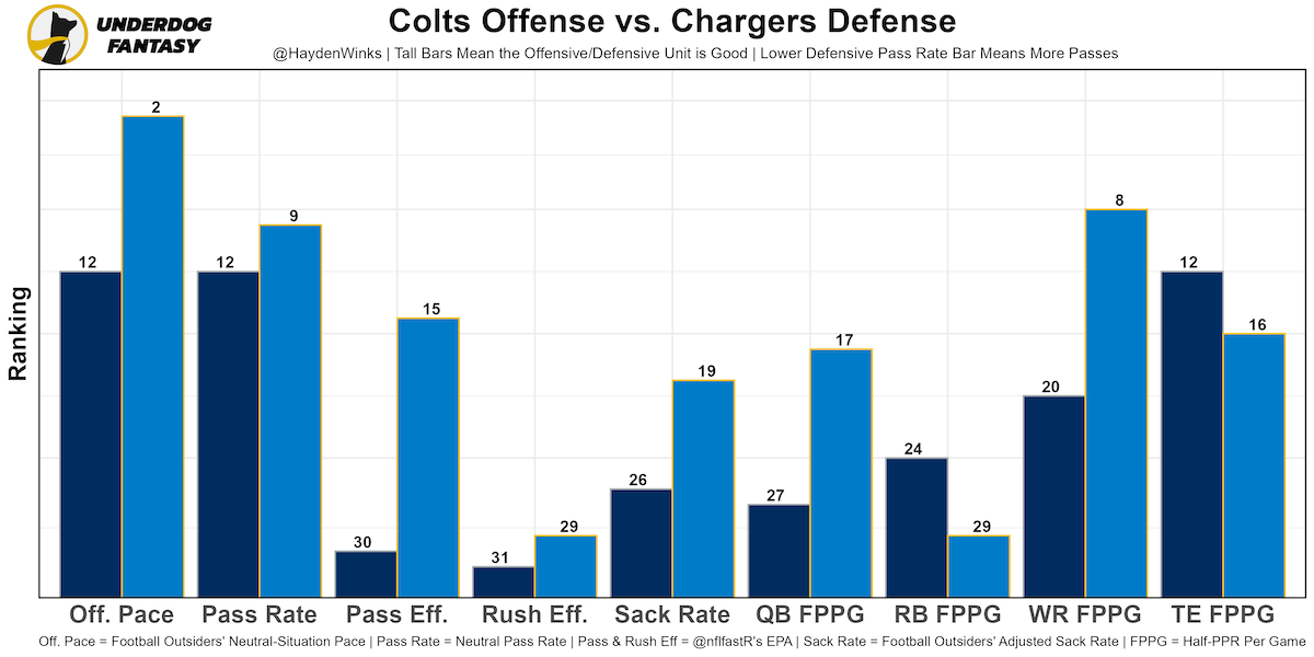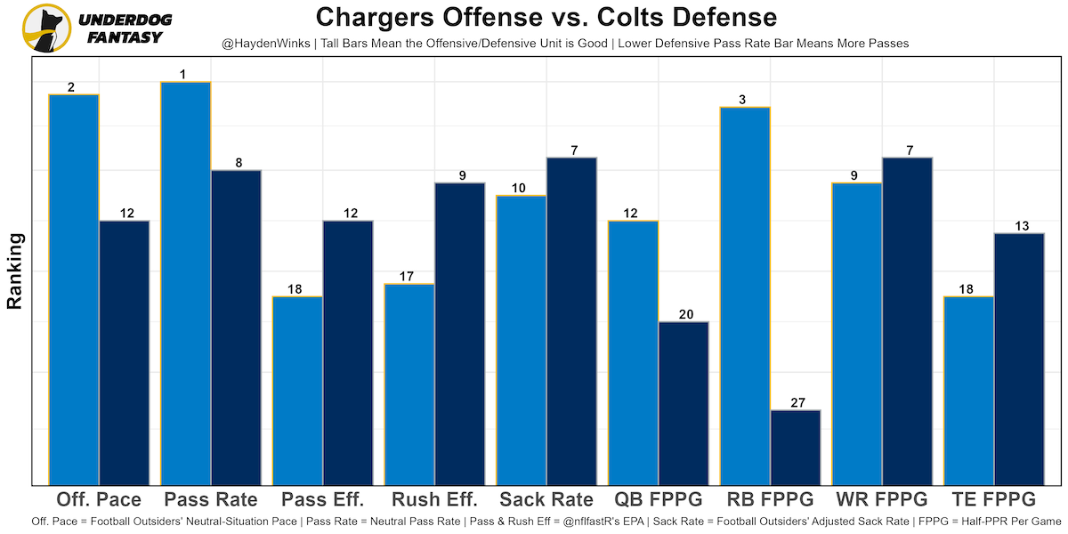 Finally surrounded by a healthy skill group, Herbert has easier paths to upside, especially indoors while the rest of the league deals with unprecedented shrinkage. In fact, Herbert's yards per attempt climbs from 6.4 to 7.3 when Mike Williams is on the field per SIS and a similar trend is replicated when C Corey Linsley is available. Both are healthy. The Colts are also coming off a depressing overtime loss where the defense played 92 snaps.