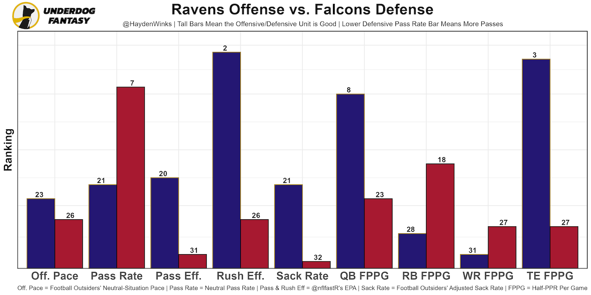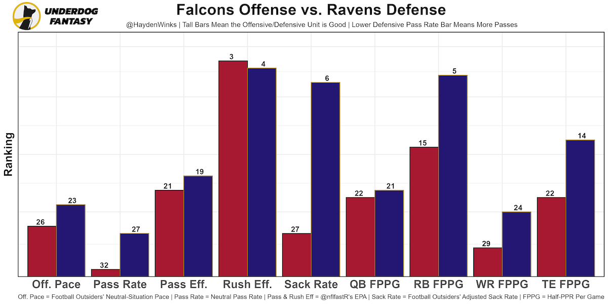 Weather is concerning (18° F with a 1% chance of snow and 16 MPH winds), and the Ravens have had a 33% and 36% neutral pass rate in the Tyler Huntley starts. This projects to be one of the most run-heavy game plans of the year, with Atlanta ranking 26th in rushing EPA allowed and 7th in neutral run rate. The good news is Huntley is a part of that run-heavy game plan. In 7 career games with 86% or more snaps, Huntley is averaging 14.4 fantasy points with 195 passing yards and 48.6 rushing yards. Those are fine enough numbers at home against a bad defense. At least the betting markets think the Ravens are going to score 21.5 points (13th).
