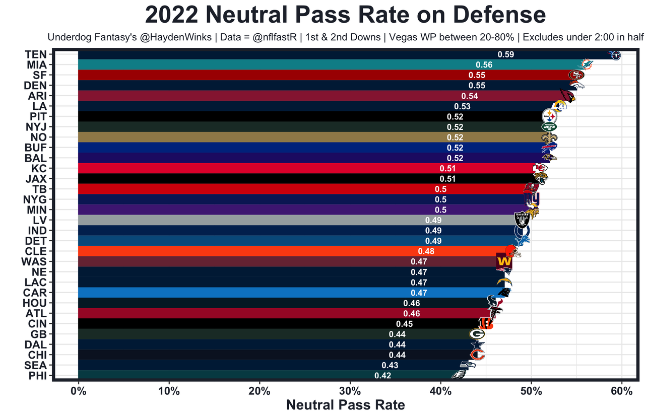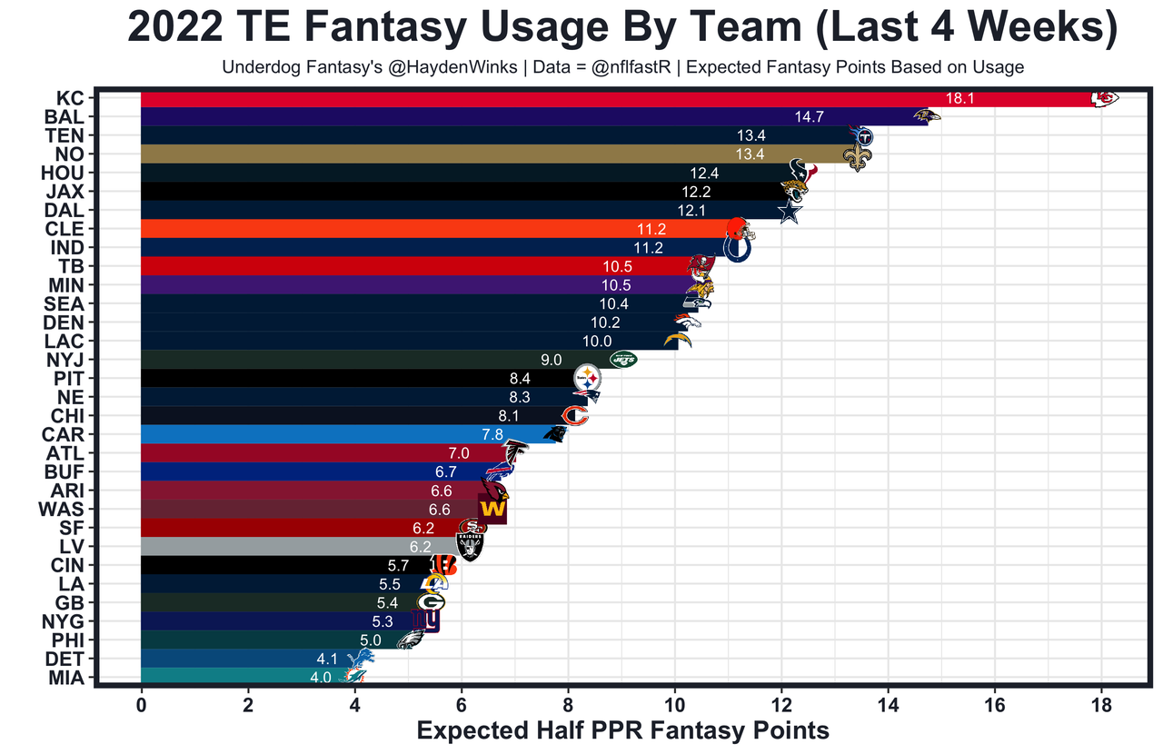 Chigoziem Okonkwo - The Titans had 25% and 28% neutral pass rates in Malik Willis' two starts this year, and when Willis does pass, it's rarely underneath. If Treylon Burks (concussion) returns as expected, it's possible Chig's rookie run comes to a hault as they could be influenced to run more 3-WR sets, thus putting either Chig or Austin Hooper on the sideline. The floor odds are high here, even if we think he's good.