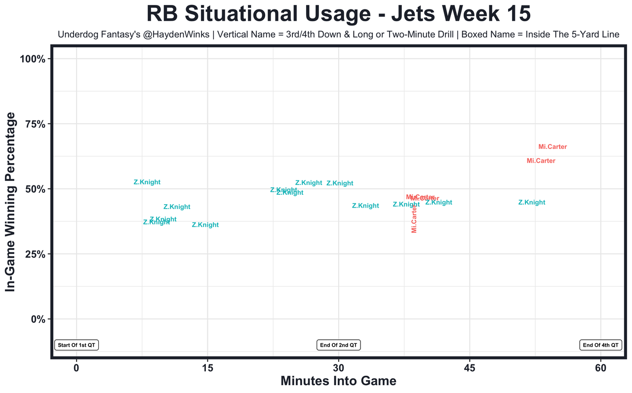 Zonovan Knight (Questionable) - He only ran a route on 8-of-41 dropbacks last week, so Knight desperately needs to be playing with a lead on Thursday Night Football. The good news is the Jets are 1.5-point home favorites and if he does have a lead, Knight will get fed carries. ... As for health, he went unlisted-unlisted-full before being listed as questionable. That's very odd. Michael Carter and Ty Johnson would take over RB duties if Knight can't play, but I think he will.