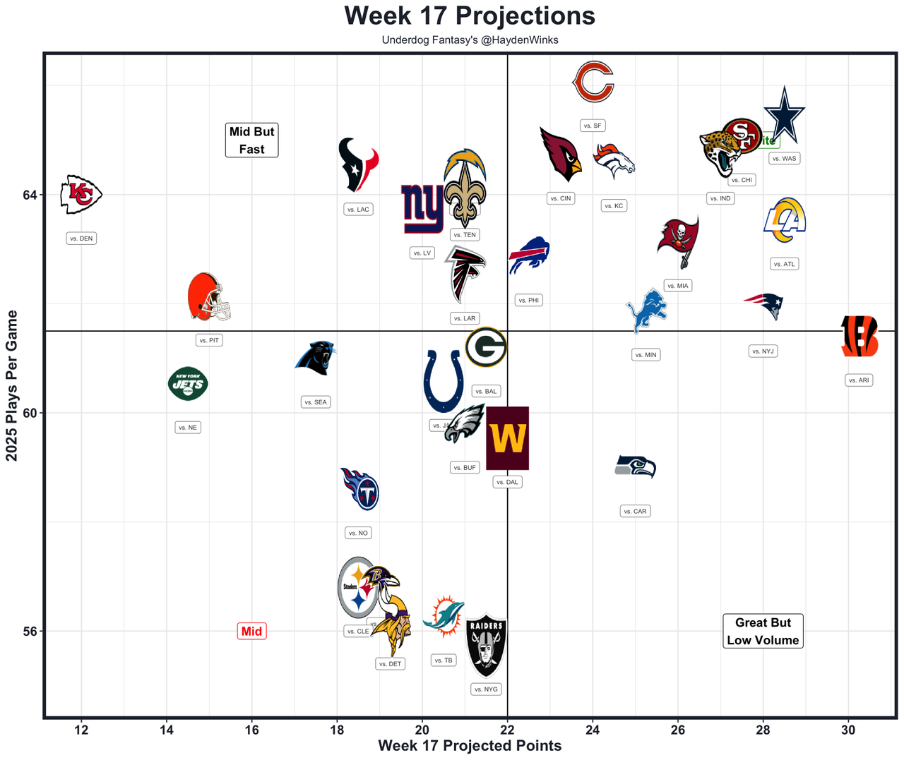 Not having Ricky Pearsall or George Kittle would hurt, but Purdy is balling out now that his toe injury is behind him. The 49ers are still projected for 27.5 points despite the injuries in what easily could turn into another shootout with the Bears coming to town. It's one of the handful of games without bad weather, and the 49ers have a lot to play for with the 1st seed within reach. Since Purdy has returned from injury, the Niners are 1st in EPA per play.