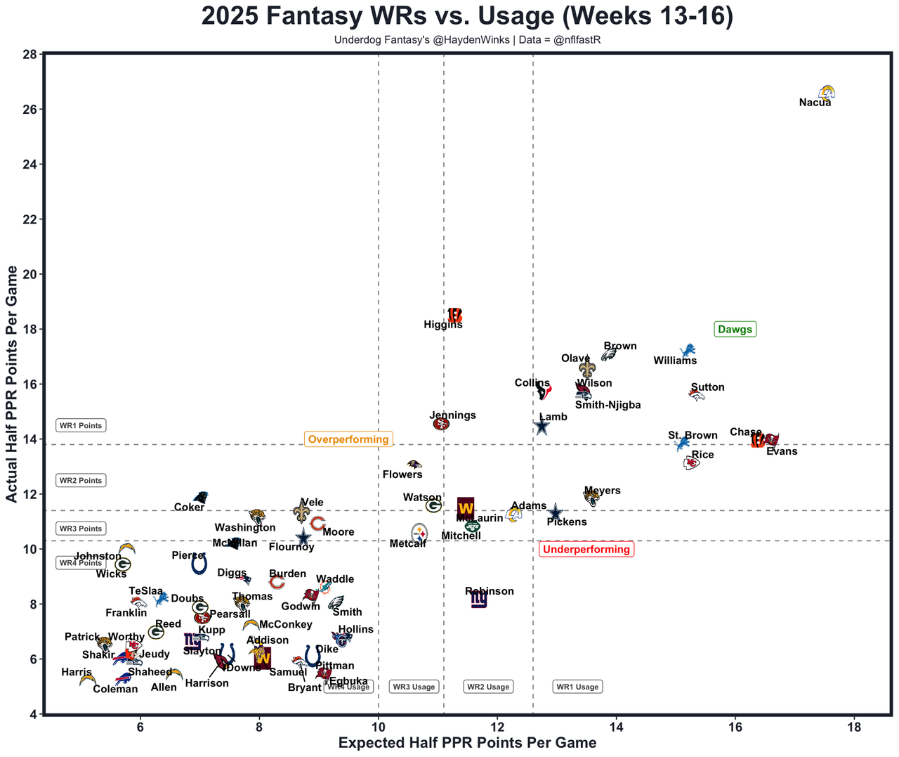 He's the RB20 on RB13 usage this month, but Jeanty was dominant on tape last week against the Texans with Geno Smith back in the mix. The Raiders' matchup this week is just simply way easier. The Giants have fired 3 coaches at different poitns of the season and are dealing with injuries up front. They've been the worst rushing EPA defense all year, and now this game is for the rights of the 1st overall pick. It's a slot fest, but Jeanty + Bowers is better than what the Giants have in the skill group. The Raiders are 1-point home favorites with a league-average team total of 21.75 points. The "let's see what happens when he's in an average offense" tweets will get a taste of the glory this week.