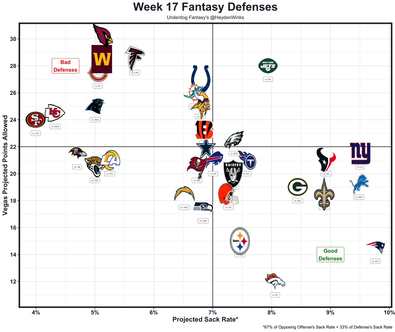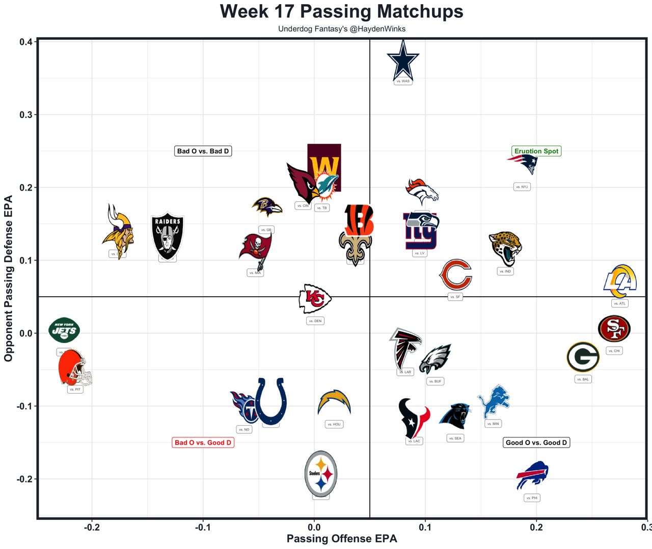 It won't be as bad as it was last week when DC Brian Flores ruined everything. The Raiders vanilla zone defense doesn't threaten Dart's mental load, and hopefully that means the Giants will actually drop back in neutral situations again. Dart's QB designed runs decreased last week after spiking in Week 15. Those are key for fantasy points, and it's unclear what New York's plan is with them. We know Dart will scramble regardless of concussion narratives. A Dart win would make sure the Giants don't draft Fernando Mendoza 1st overall, so there's plenty of pressure here.