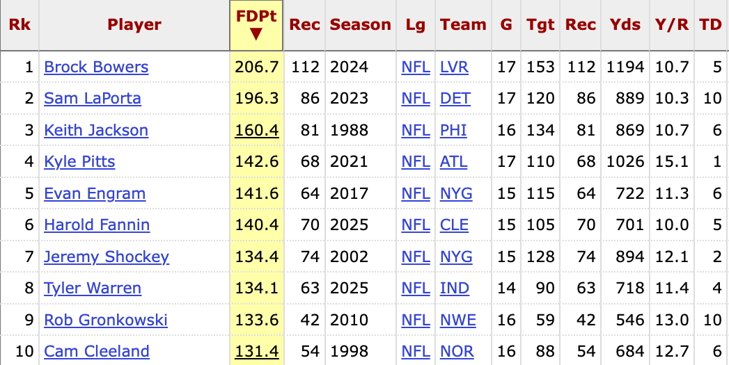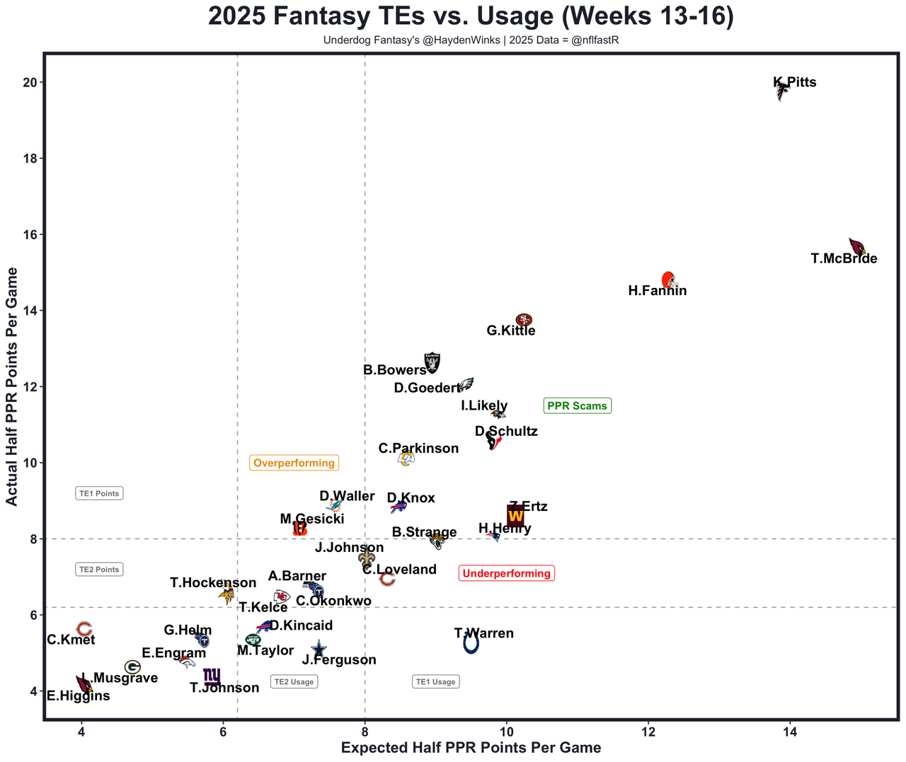 He's the TE3 on TE3 usage this month with David Njoku (knee) out. Over the last 3 weeks without him, Fannin is averaging an elite 14.2 expected half PPR points as the scam of the year (complementary). His tape is fantastic, however. He's a menace to bring down, which gives him manufactured touches every week, but the rookie can also run downfield routes, providing a weekly ceiling. Right now, Fannin is the rookie TE6 all time with a chance to get to TE3 if he keeps this up.