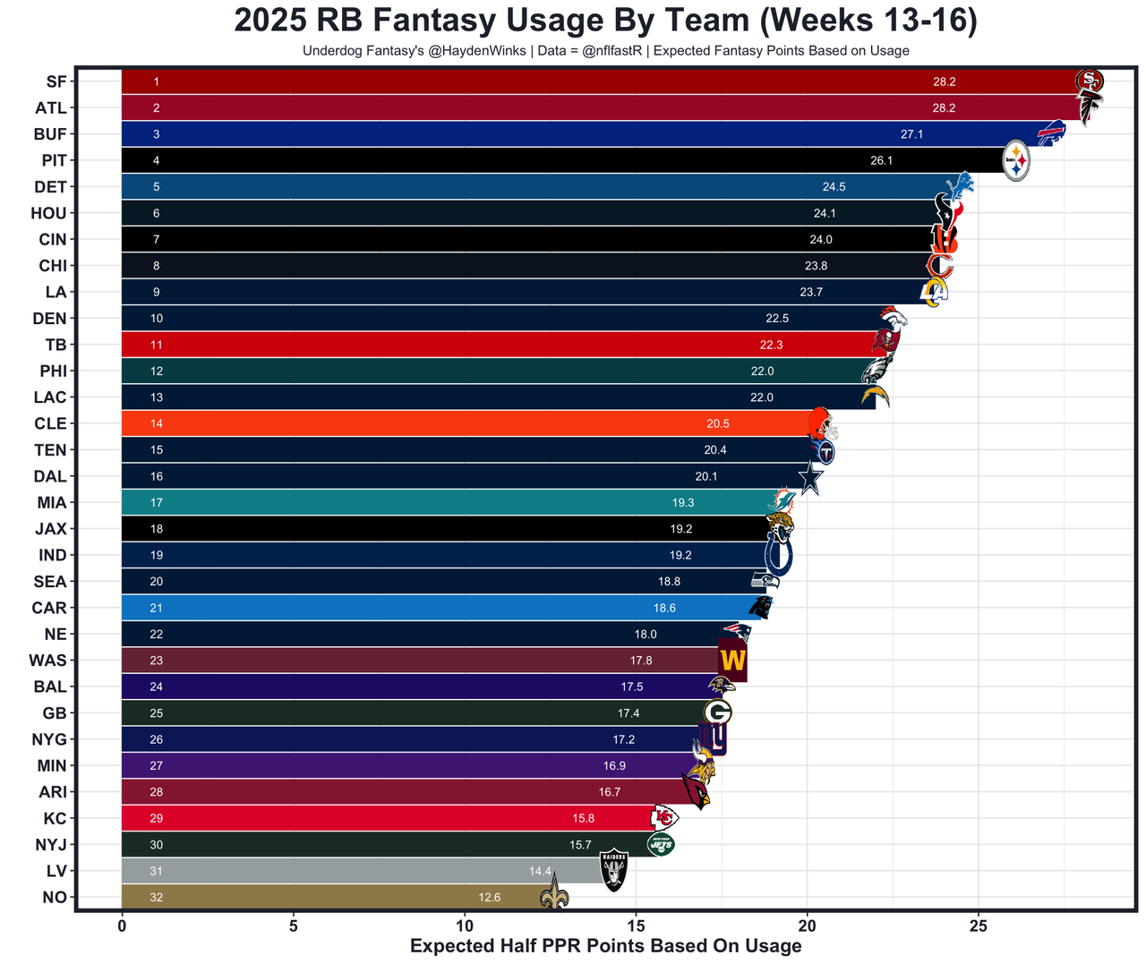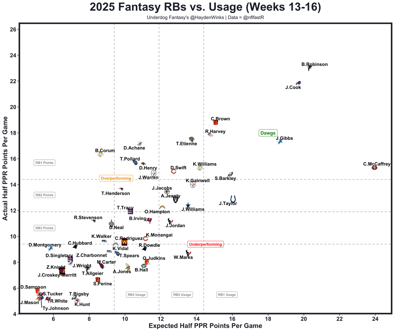 Last week was a season-high 17.1 expected half PPR points because the Titans actually had a blowout win against the Chiefs' QB3. It's not something we can bank on moving forward, but the Titans' OL and QB play have improved recently. He's the RB35 on RB32 usage.