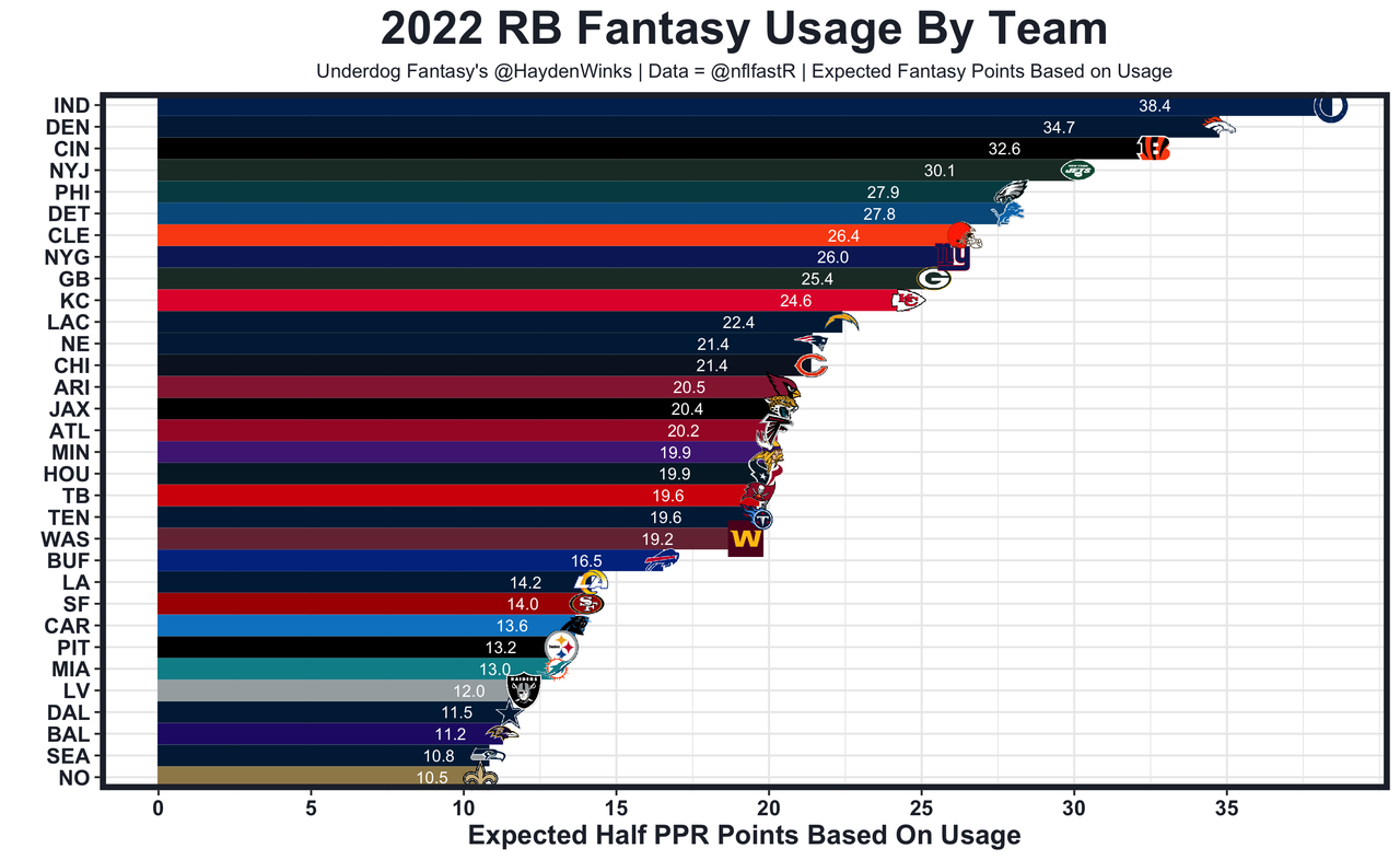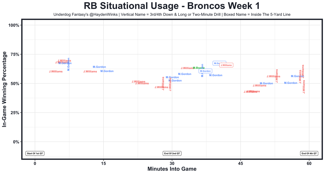 Javonte Williams - 57% snaps and 62% routes in this chaotic Week 1 rotation. Williams broke a bunch of tackles and caught comeback mode passes, but did fumble at the goal line. So did Melvin Gordon. In general, this is a 60/40 split in favor of Williams, but this year, the Broncos will actually be scoring points. Denver RBs combined for the 2nd-most expected half PPR points last week.