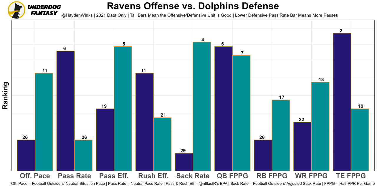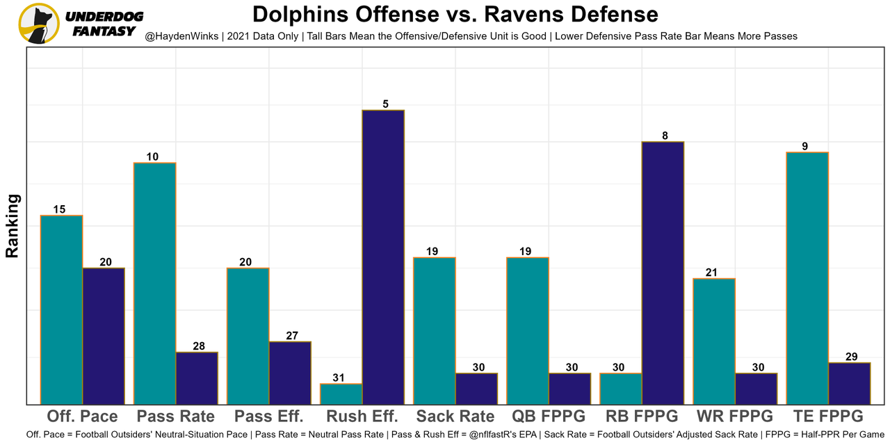 He was horrendous in Week 1, particularly with arm strength, but Tyreek Hill and Jaylen Waddle bailed him out. The offensive structure is decent and plays to Tua's strengths, too. In Week 1, they used play action on an absurd 46% of dropbacks, which was slightly higher than last year's 43%. The OL, while improved, still projects as a bottom-10 unit and will face pressure from Baltimore. Miami is 24th in projected points this week.