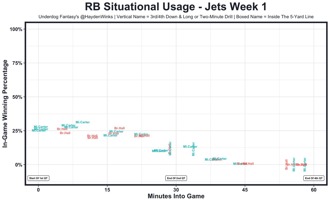 Michael Carter - He started and played more snaps than Breece Hall, 60% to 45%, but both got home in the box score thanks to garbage time checkdowns with the immobile Joe Flacco. Carter, right now, is the more consistent player and a highly underrated between-tackles ball-carrier. Expect him to lead Hall in most categories, especially after the rookie fumbled in Week 1. And view each game without Zach Wilson as a win.
