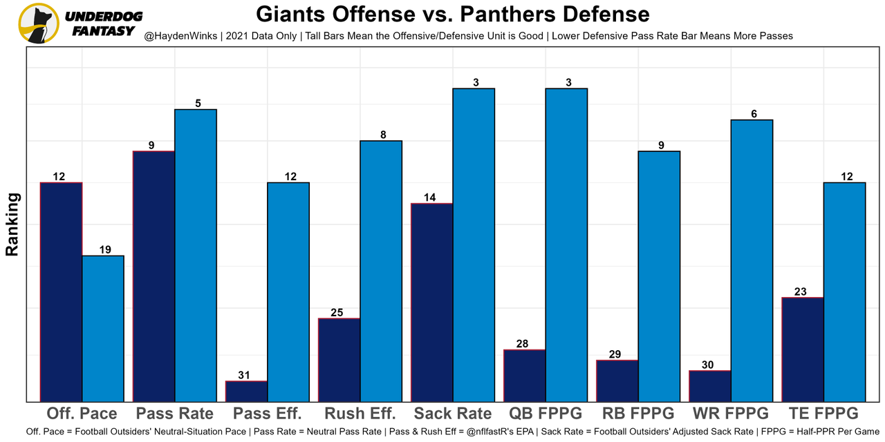 The offense is much different with new OC Ben McAdoo. They were 1st in neutral pass rate and 5th in neutral pace. There are enough playmakers for the Panthers to be a successful fantasy offense,,,, if Mayfield can handle it. This is a clean matchup with the Giants secondary lacking much talent and the front seven lacking due to injury. Carolina is projected for a slightly below average 20.75 points.