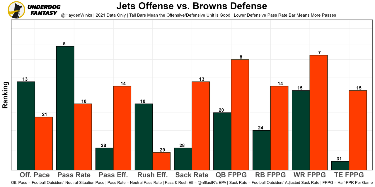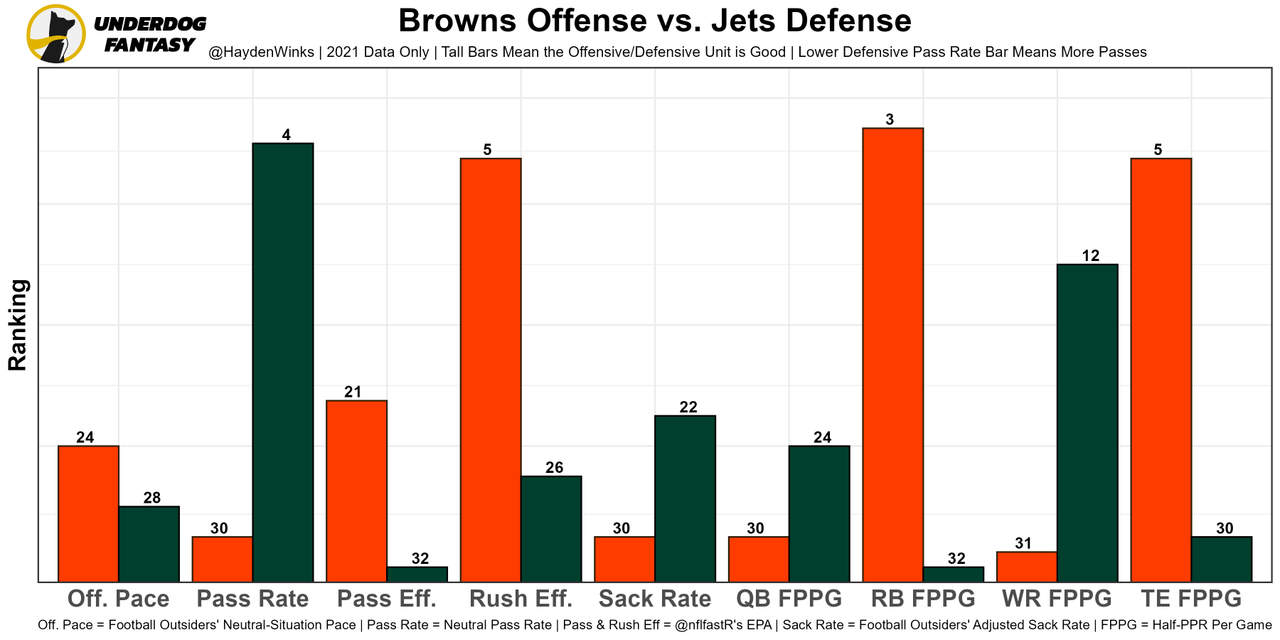 Nick Chubb - An absolute dog. But RB20 fantasy usage, 28% routes, and will split touches at the goal-line with Kareem Hunt, who had a FB leak receiving TD last week. The matchup against the Jets opens up more positive game script for Chubb this week.