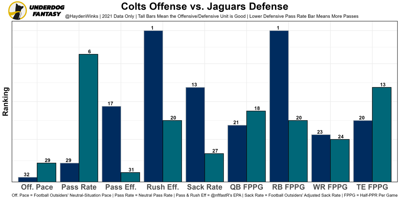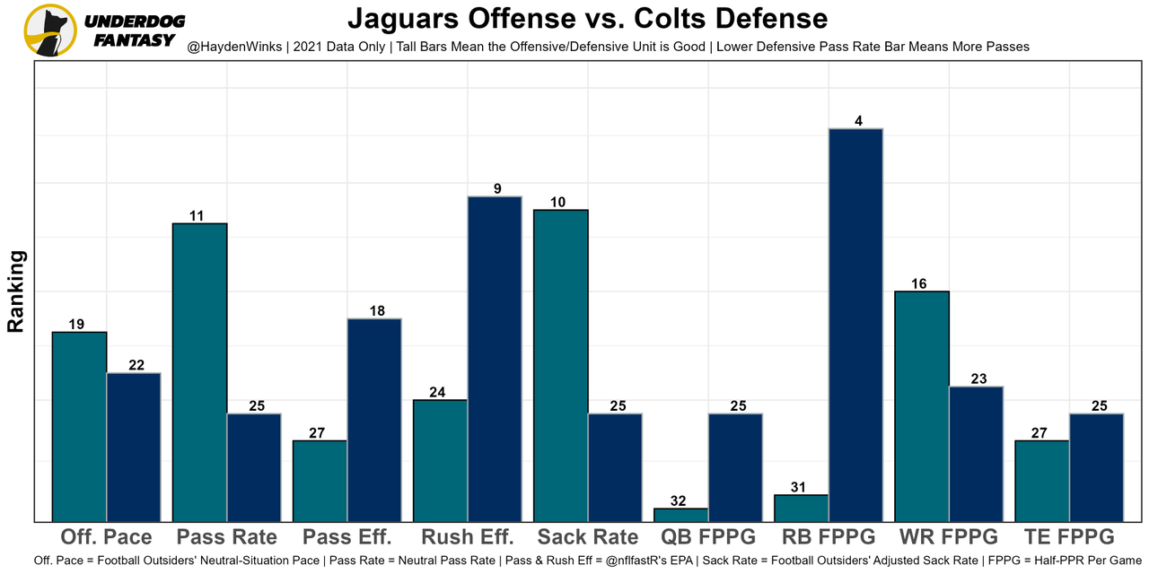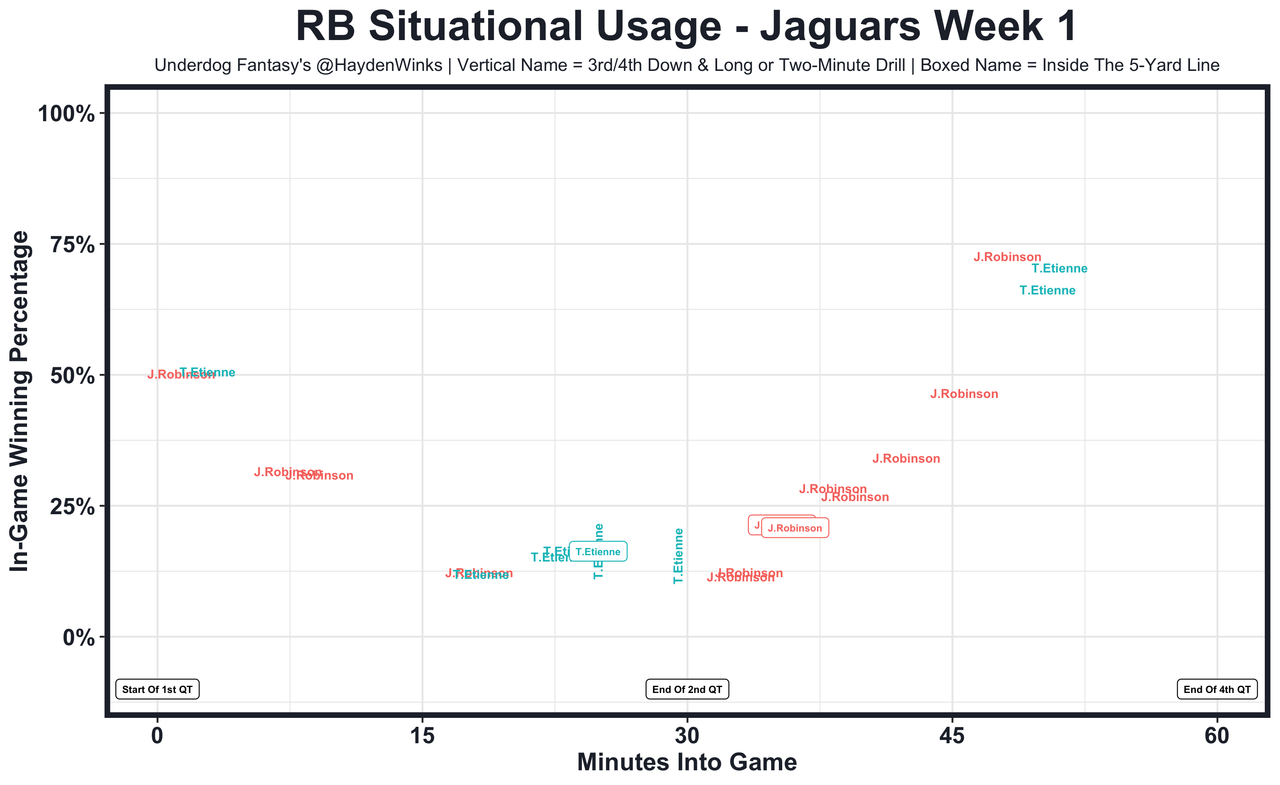 James Robinson - Rapoport believes the Jaguars will "split carries" and run the ball more in general this week. He also mentioned that it'll look like the second half of last week, which favored J-Rob as you can see in the chart below. ... For the rest, see RB35 Travis Etienne.