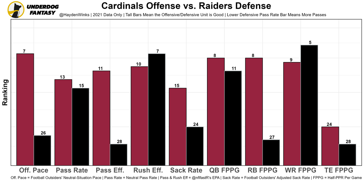 The OL was brutal in Week 1 and the Raiders DL can bring it on the edge. Murray will have to create more by himself while DeAndre Hopkins and Rondale Moore (DNP Thursday) are sidelined, and the betting markets aren't very optimistic. Arizona is 18th in projected points this week.