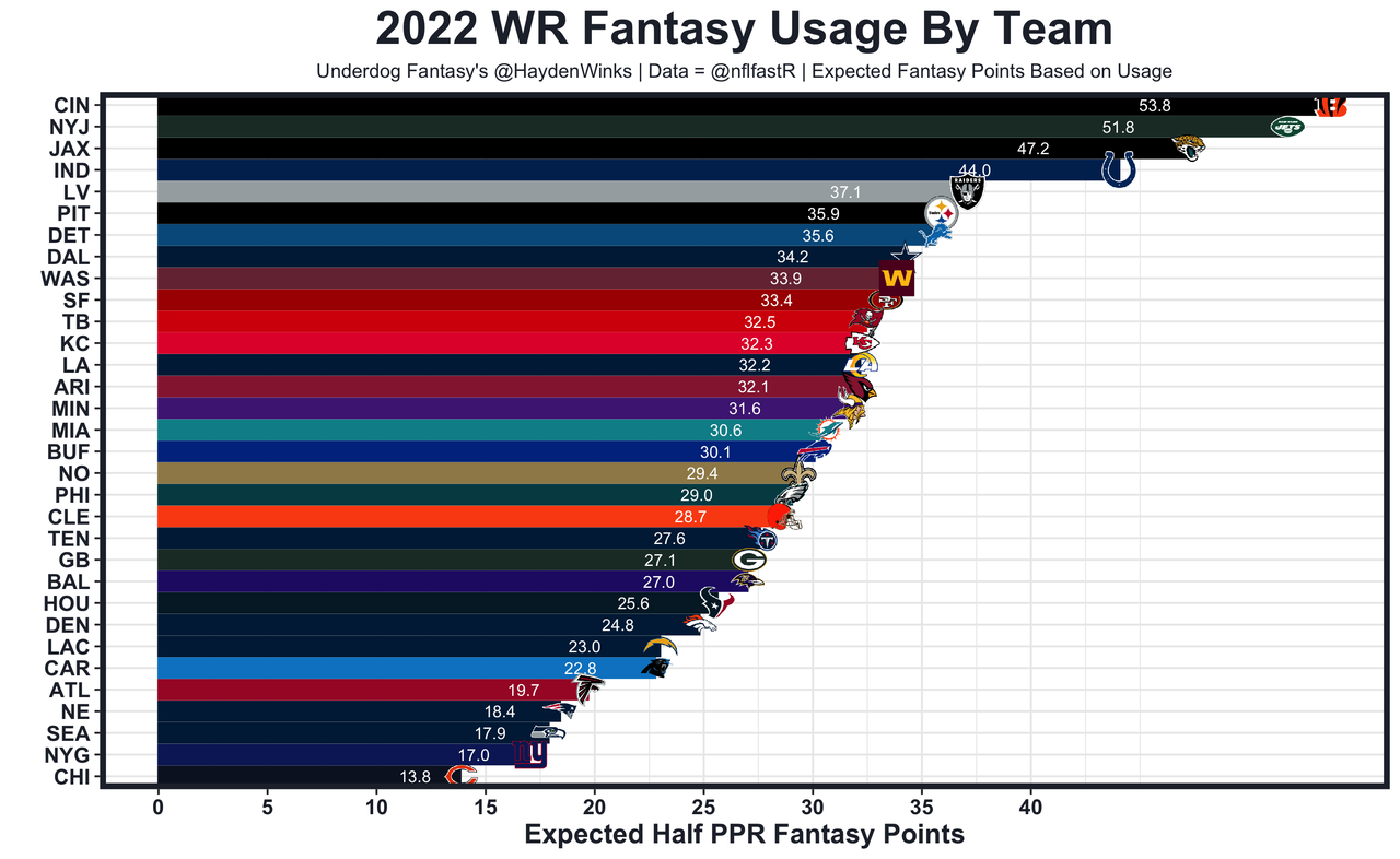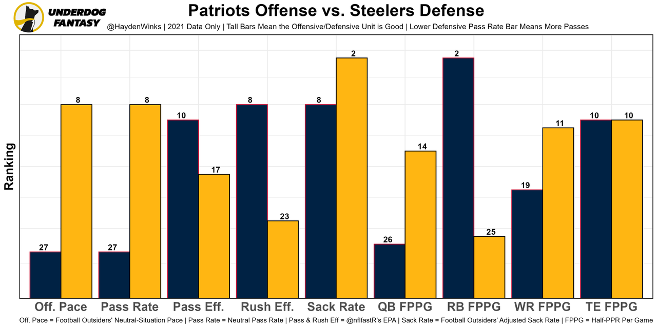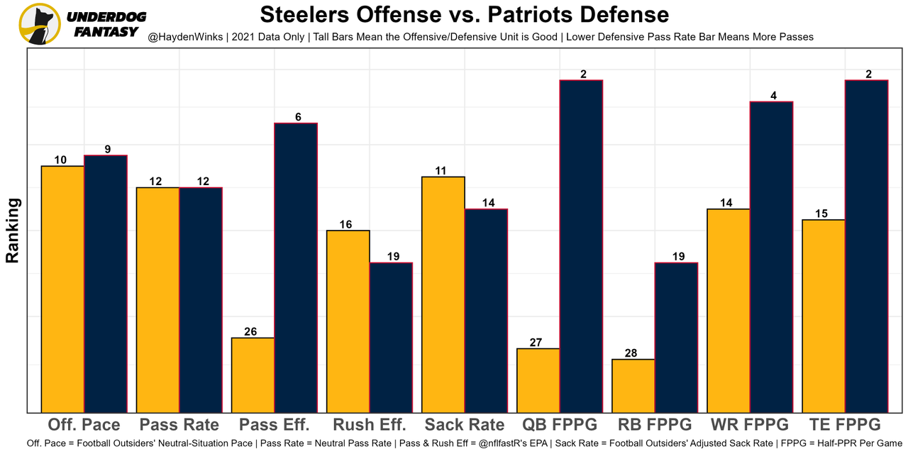 Diontae Johnson - The Steelers are 8th-worst in projected points this week. DJ has to overcome that, along with strong target competition. Mitch Trubisky's Week 1 tape has me terrified. Inaccuracies and poor decision making all over the place. He was the WR41 on WR14 fantasy usage and his Underdog Fantasy Pick'em projection is set for 54.5 receiving yards.