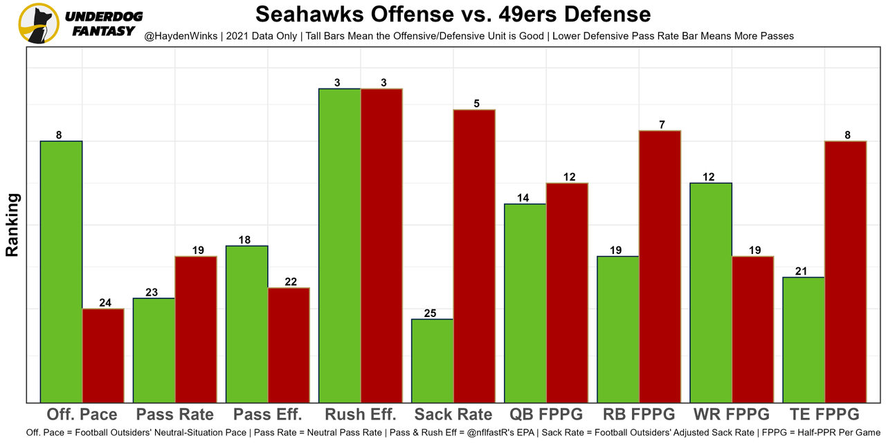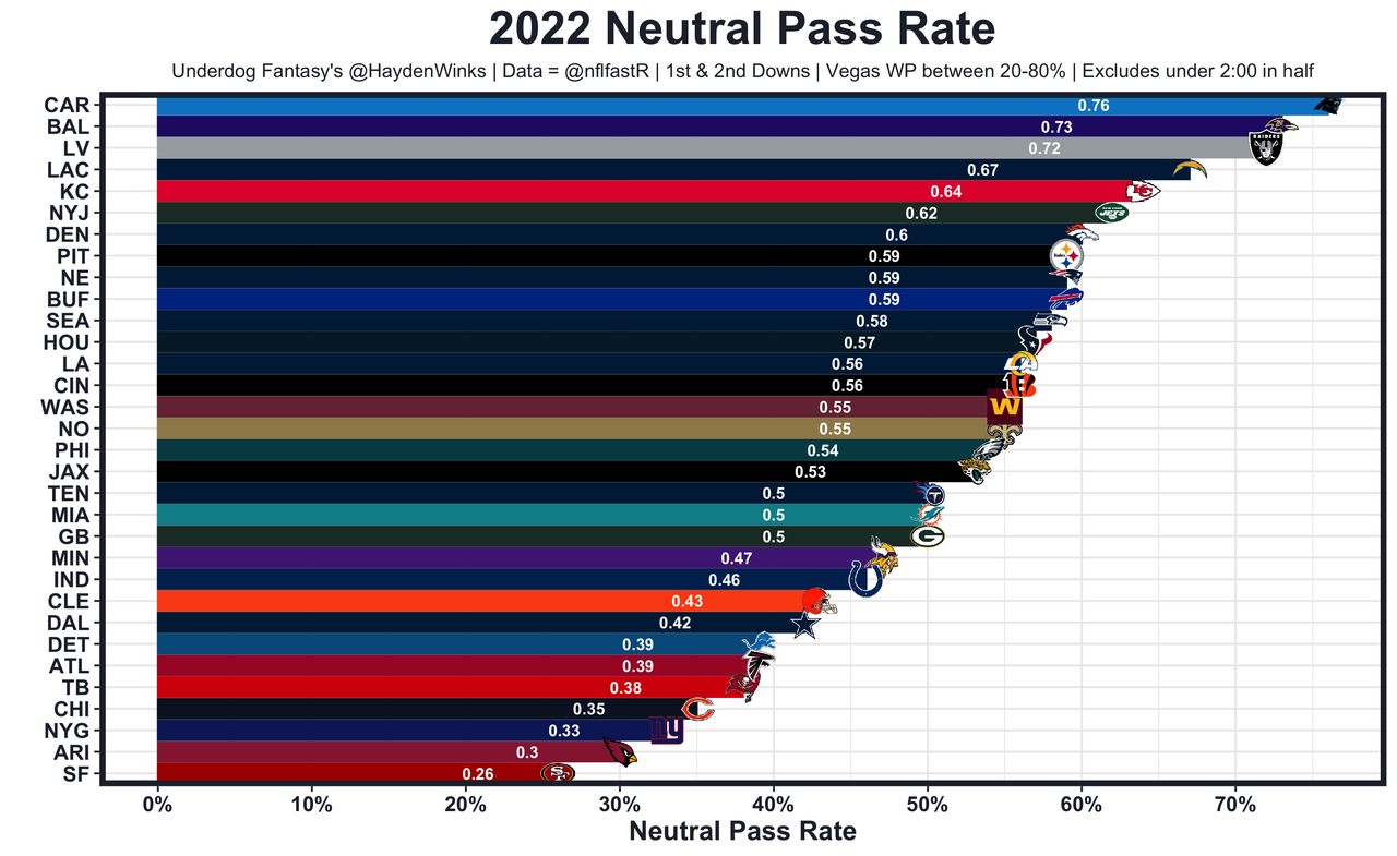 More on this later, but Geno Smith is a fun watch and played well last week. In fact, PFF had him as the QB2 in grades. The Seahawks also surprised us with a No. 9 neutral pass rate.