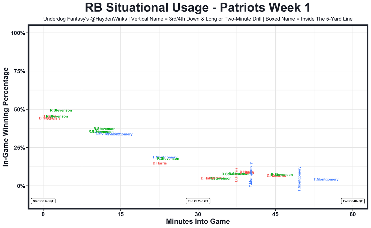 Damien Harris - Their Week 1 snap rates -- Harris (39%), Rhamondre Stevenson (25%), and Ty Montgomery (36%) -- had me quite worried, but Ty Montgomery is on injured reserve now. I doubt another RB will mix in much at this point, leaving Harris and Stevenson mostly rotating drives. As a team, the Patriots combined for 21.4 expected half PPR points last week despite trailing for most of the game.