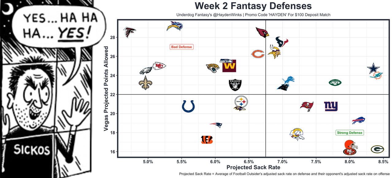 The projected sack rates are using 2021 data as a heads up. This week, The Sickos Committee is rolling with the Packers, Browns, 49ers, Bills, Rams, Broncos, Giants, and Bucs.