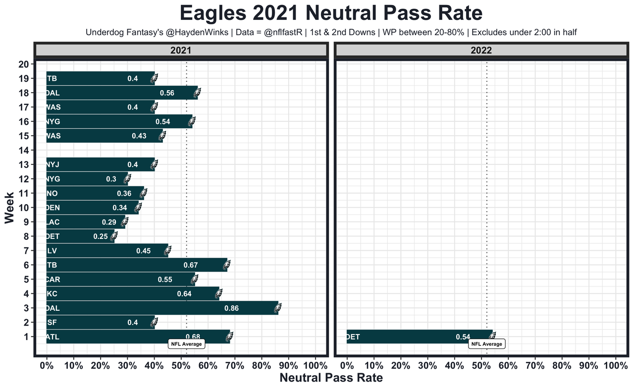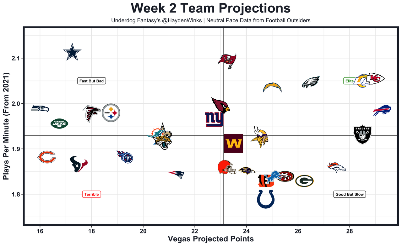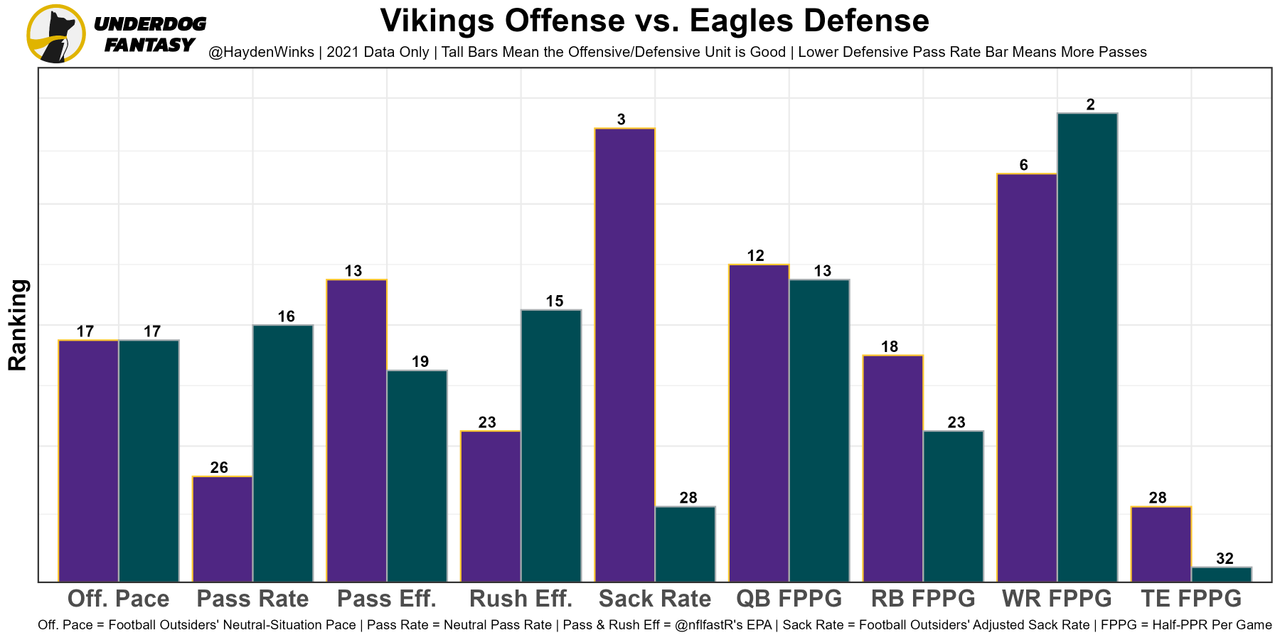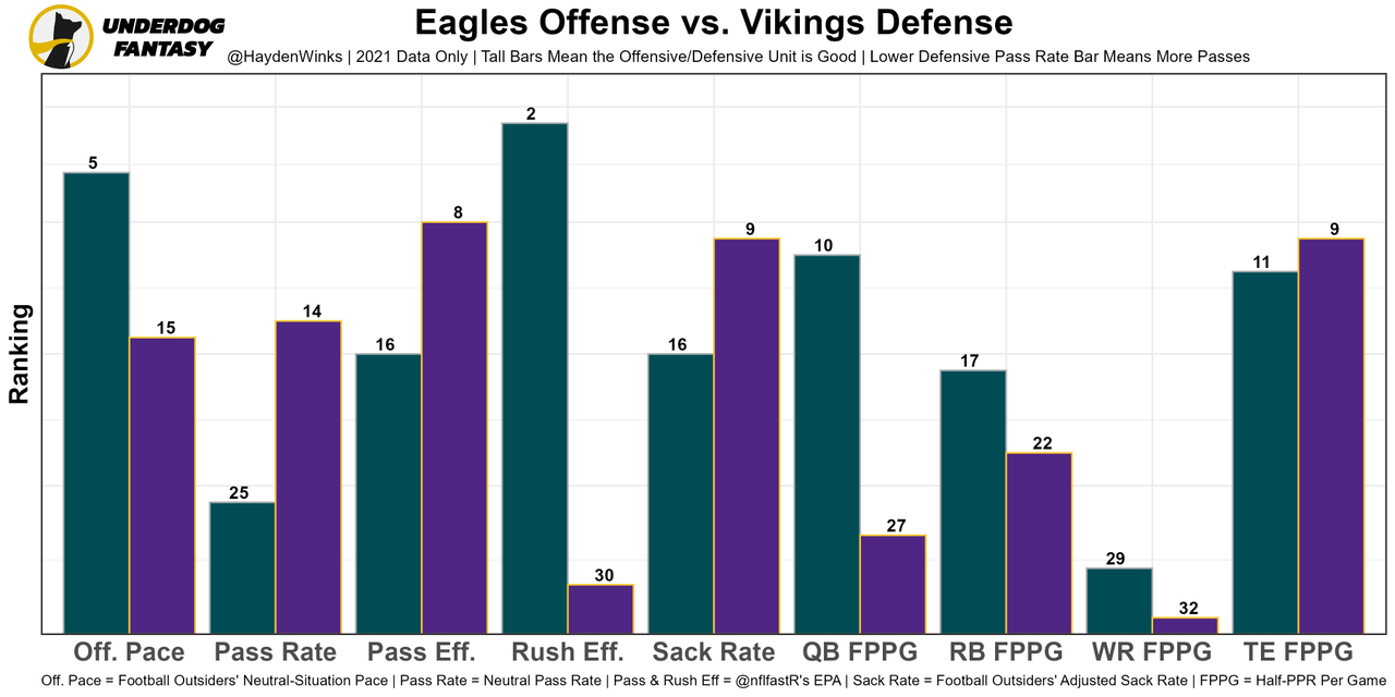 The analytical-minded Eagles want to pass the ball, and they did so (to some degree) in Week 1. Their 54% neutral pass rate is more in line with the Eagles' 2021 first month, likely because they have more confidence with certified baller A.J. Brown opening up the middle of the field. Hurts is benefitting from the weapons' YAC skills, while adding rushing TDs on goal-line read options. The Vikings' secondary has holes, and their offense will push pace under new coaching. This has big game written all over it. Philadelphia is 6th in team total this week.