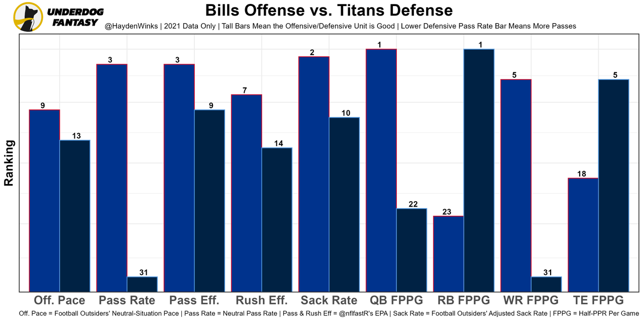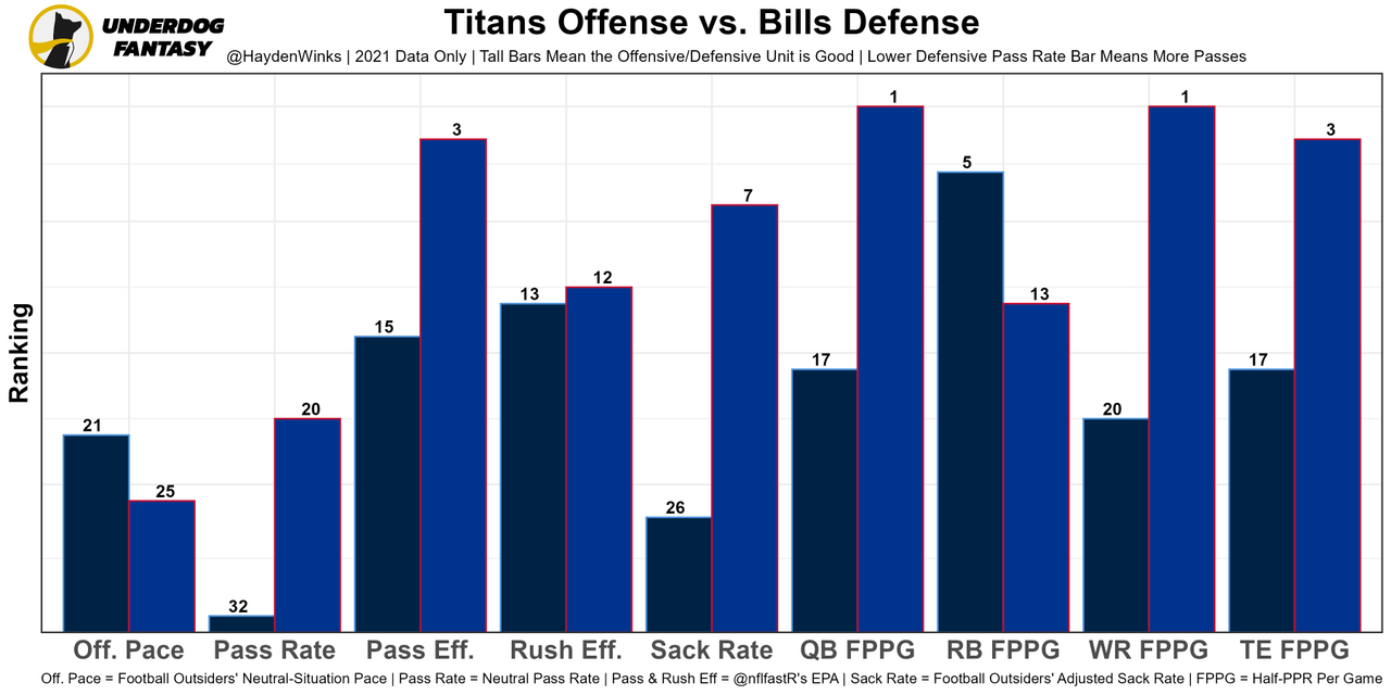 Stefon Diggs - Like he did in the preseason, Diggs was both the clear top target on passing downs but did only run a route on 79% of dropbacks because he was subbed out on rushing downs for bigger bodies. This high ranking is hat tip to how good of a player Diggs is. He was the WR21 in fantasy usage last week. The Titans are missing CB Kristian Fulton and slot CB Elijah Molden.
