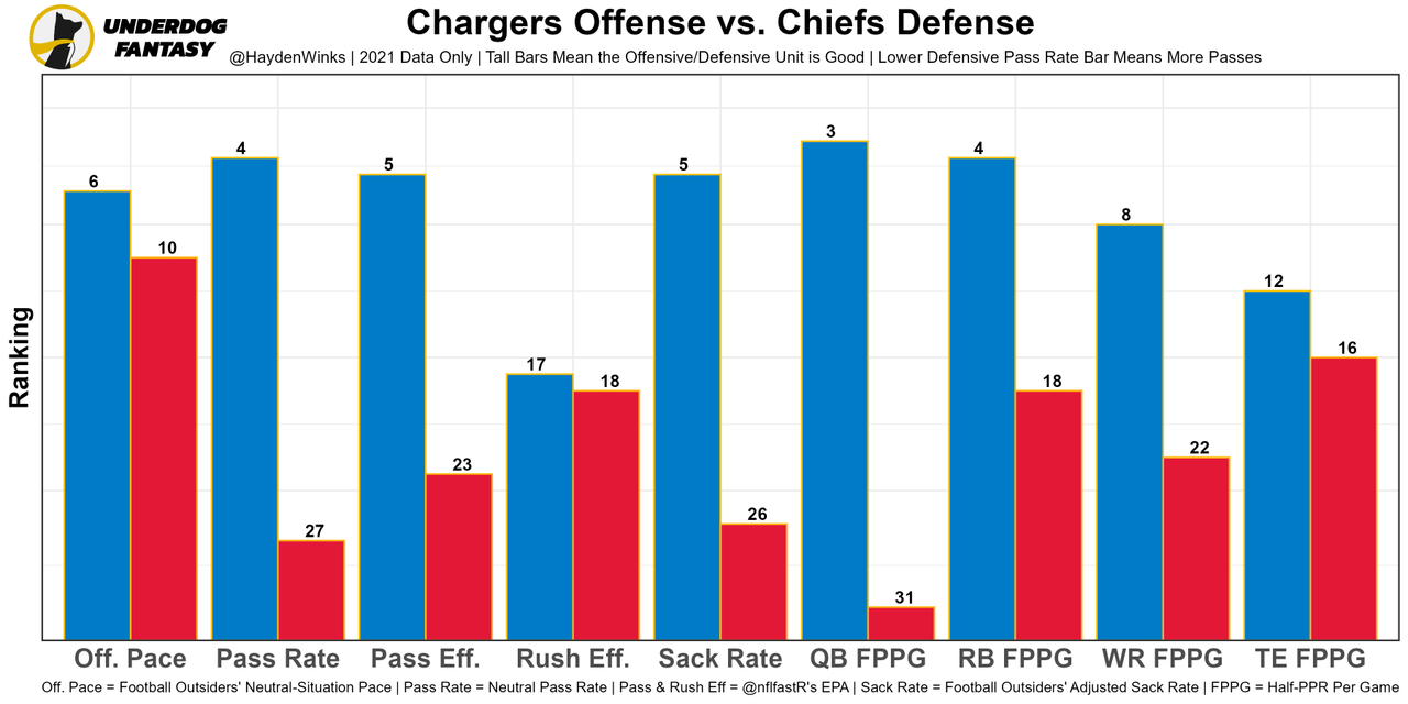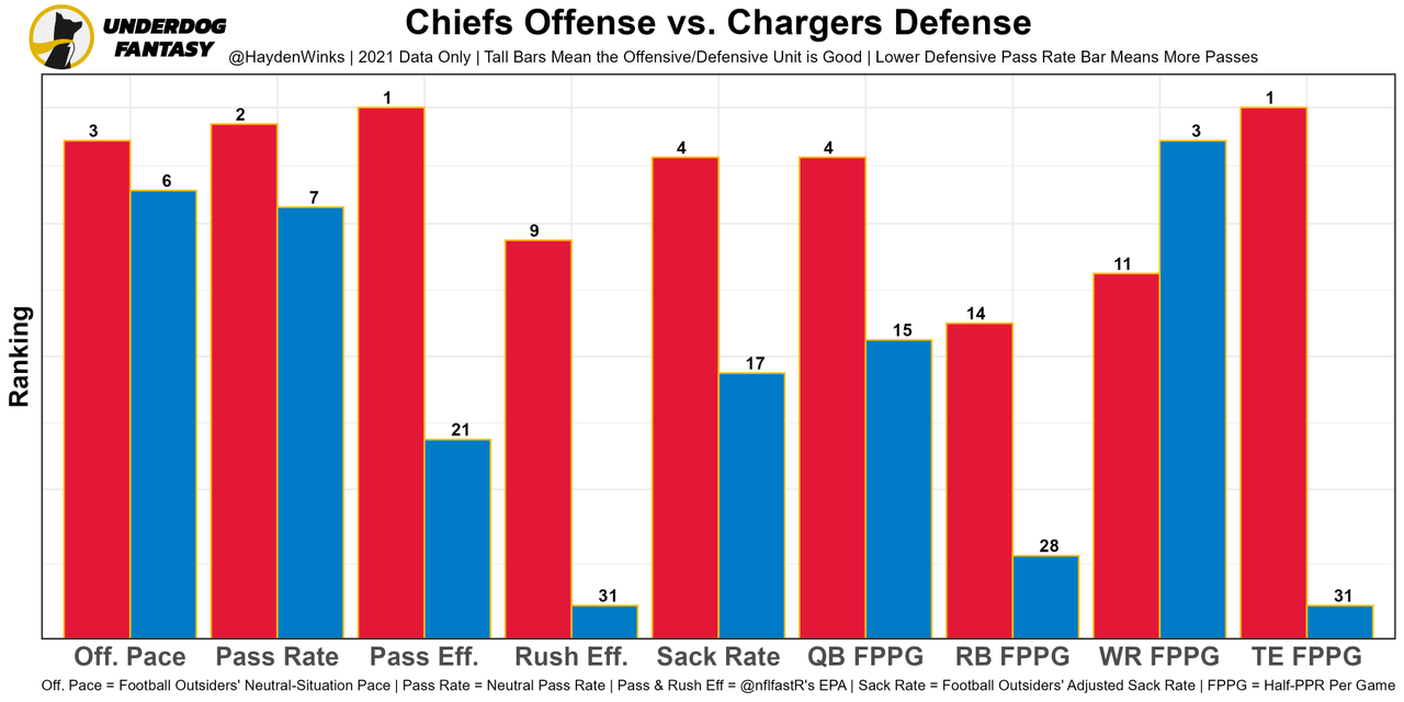 JuJu Smith-Schuster - Week 1 routes: Marquez Valdes-Scantling (80%), JuJu (80%), Mecole Hardman (61%), and Skyy Moore (20%). In closer matchups like this Thursday's, there will be even more passing volume. JuJu's 20% target share led to WR28 fantasy usage. There could be extra underneath looks this week with the Chargers playing in a two-high shell at top-10 rates. Last note, JuJu played on the perimeter on 57% of snaps last week, which would be a career high if it holds this season. I'm expecting more downfield routes from him in 2022.