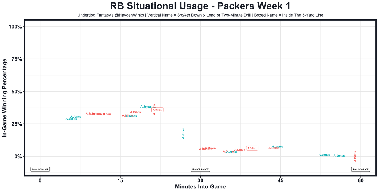 Josh Jacobs - Missed at least three blocks in pass protection, despite being subbed out in clear passing downs. Like really, really struggled here. Jacobs was the RB40 last week with the Raiders trailing, but his Underdog Fantasy Pick'em projection is set for 14.15 half PPR points. To pay that off, the Raiders need to get down to the goal line. Even then, Vegas could pass the ball there, just like the Packers did repeatedly with Davante Adams.