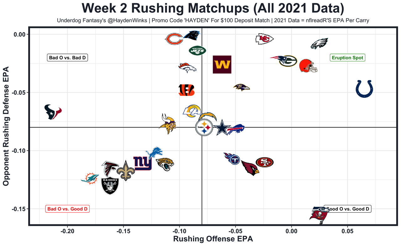 Antonio Gibson - He's splitting time (58% routes) with passing-down specialist J.D. McKissic, but Gibson will handle goal-line work and was used creatively by OC Scott Turner in the pass game. He's an inconsistent pass protector, so they used Gibson on screens, on wheel routes, and with 2-RB set downfield shots to get him out on the route quicker than normal (video). His 15.3 expected half PPR points were the 9th-most among RBs last week, and Washington's 23.5 points are respectable. Let's just hope Gibson doesn't fumble.